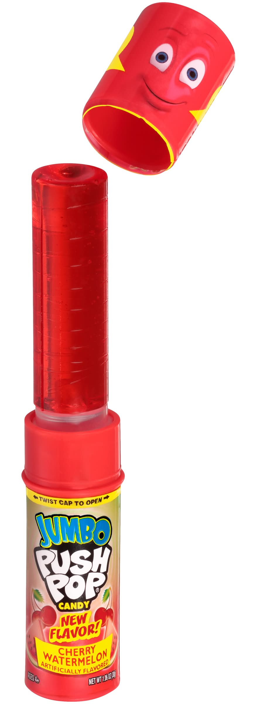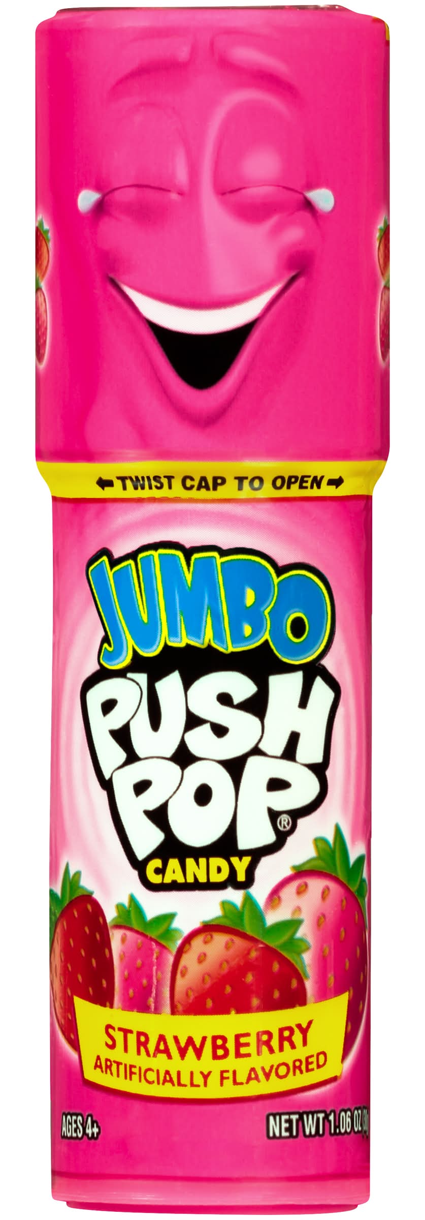 Purchase the Assorted Jumbo Push Pop Candy at Michaels. Each Jumbo Push Pop is spring loaded, so the candy "Jumps" out when the cap is removed. Jumbo Push Pop is a super-sized delicious and simple lollipop. Simply push and enjoy! Available in multiple flavors. 1.06 oz.. 1 candy (flavor will vary) Flavor: Strawberry