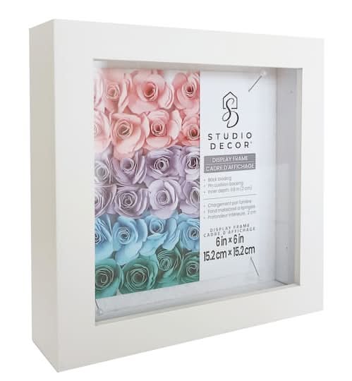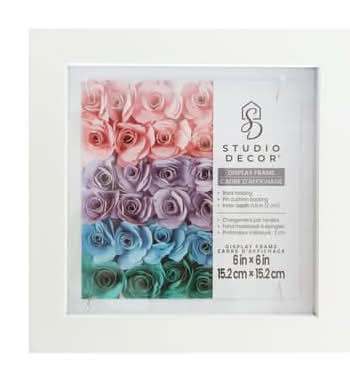 This display case is the perfect size to show off your crafts and artwork. The pin cushion backing and flat white frame will make your work easy to see.. Available in multiple sizes. 0.8" (2 cm) inner depth. Back loading. Hanging hardware attached. Flat White Display Frame by Studio Decor • Color: White • Size: 6x6 in