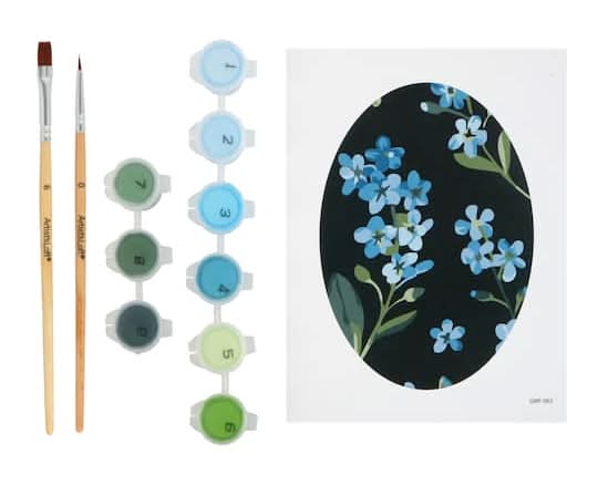 Find the Blue Flowers Paint-by-Number Framed Mini Kit. This paint-by-number acrylic framed mini kit is perfect for engaging your crafty side.. 5" x 6.9" (13.5cm x 17.5cm) overall finished size/frame size. 163 numbered sections. Conforms to ASTM D-4236. Cotton canvas, resin frame, acrylic painting pots, wood brushes. 1 - 4" x 5.6" (10.3cm x 14.3cm) canvas sheet (without frame), pre-printed with guidelines and numbers 1 - 5" x 6.9" (13.5 cm x 17.5 cm) decorative frame with magnet and easel attached Color: Blue