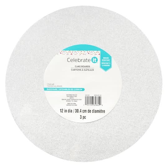 Find the 12" Silver Glitter Cake Boards by Celebrate It, 3ct. at Michaels. Show off your beautifully crafted homemade cakes with an extra bit of flair using these glittery silver cake boards from Celebrate It. Grease resistant and food safe, use with a complimentary cake stand or platter to display your creations at bake sales, school and office parties and other fun celebrations. Silver with glitter accents. 12" x 12" (30.4cm x 30.4cm) board size. 3 boards. Paper and plastic. 12" Silver Glitter Cake Boards by Celebrate It, 3ct. • Color: Silver • Size: 12"