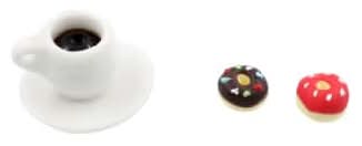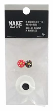 Buy the Mini Coffee & Donuts Set by Make Market at Michaels. Add this miniature coffee cup and donuts by Make Market to your doll house project. White, brown and pink. 0.23" x 0.33" x 0.33" (0.584cm x 0.838cm x 0.838cm) donut size. 0.6" x 0.87" x 0.87" (1.524cm x 2.2cm x 2.2cm) coffee cup size. 3 pieces. Porcelain, clay and glue