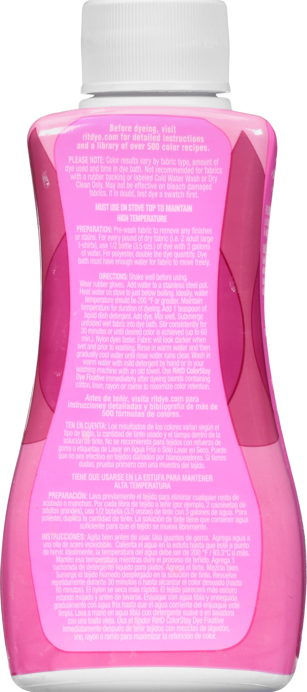 Please note: color results vary by fabric type, amount of dye used and time in dye bath. not recommended for fabrics with a rubber backing or labeled cold water wash or dry clean only. may not be effective on bleach damaged fabrics. if in doubt, test dye a swatch first. must use on stove top to maintain high temperature. preparation: pre-wash fabric to remove any finishes or stains. for every pound of dry fabric (i.e. 2 adult large t-shirts), use 1/2 bottle (3.5 ozs.) of dye with 3 gallons of water. for polyester, double the dye quantity. dye bath must have enough water for fabric to move freely. directions: shake well before using. wear rubber gloves. add water to a stainless steel pot. heat water on stove to just below boiling. ideally, water temperature should be 200 degrees f or greater, maintain temperature for duration of dyeing. add 1 teaspoon of liquid dish detergent add dye. mix well. submerge unfolded wet fabric into dye bath. stir consistently for 30 minutes or until desired color is achieved (up to 60 min.). nylon dyes faster. fabric will look darker when wet and prior to washing. rinse in warm water and then gradually cool water until rinse water runs clear. wash in warm water with mild detergent by hand or in your washing machine with an old towel. use rit colorstay dye fixative immediately after dyeing blends containing cotton, linen, rayon or raime to maximize color retention.