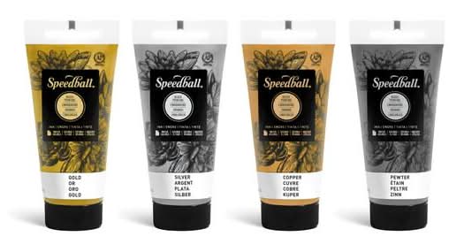 Purchase the Speedball Block Printing Metallic Ink Set at Michaels. Speedball Water-Soluble Block Printing Inks print in bold metallic color and dry to a rich, satiny finish. These inks are great for printing with linoleum, wood or soft block surfaces onto paper. Includes assorted metallic colors. 1.25 fl. oz. (37 mL) each. Set of 4 inks. Conforms to ASTM D 4236. Speedball Block Printing Metallic Ink Set