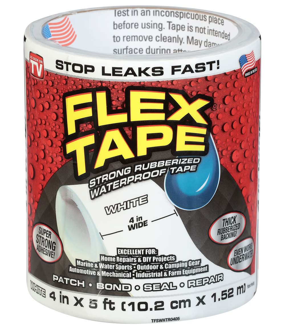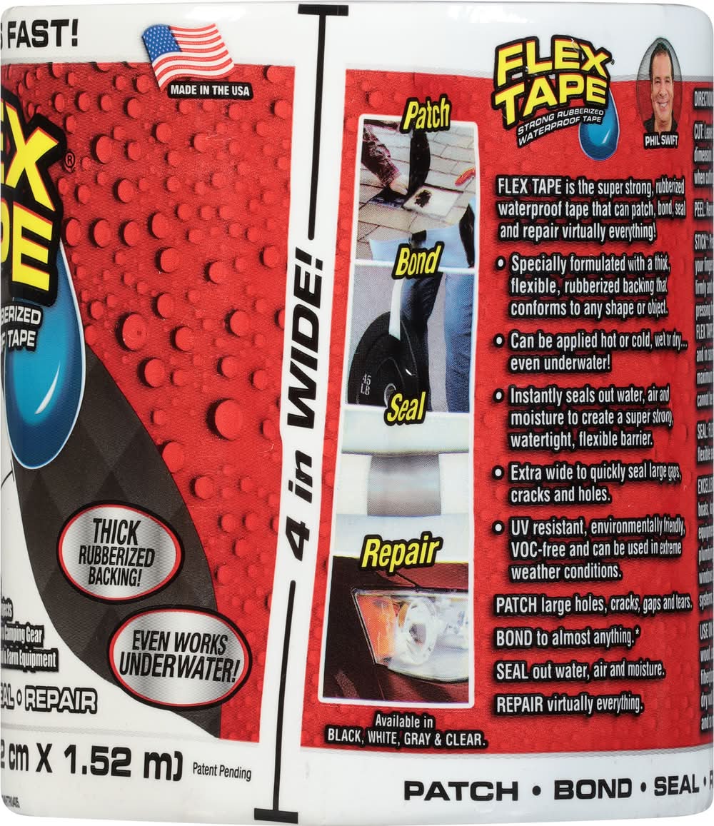 Usage of instructions:use on: pvc, acrylic, metal, steel copper, aluminum, wood, ceramic, porcelain, tile, glass, rubber, fiberglass, stucco, plaster, stone, cement, concrete, dry wall, epdm roofs, some plastics, fabrics, vinyls and so much more! - directions: use on: pvc, acrylic, metal, steel copper, aluminum, wood, ceramic, porcelain, tile, glass, rubber, fiberglass, stucco, plaster, stone, cement, concrete, dry wall, epdm roofs, some plastics, fabrics, vinyls and so much more! just cut, peel, stick & seal! cut: leave backing on tape and cut to desired dimension. use high quality scissors or razor blade when cutting. peel: remove backing and apply to a clean surface. stick (flex tape adhesives may resist bonding to plasticized materials, siliconized, greasy, oily, dirty or porous surfaces, waterproof or water-repellent materials. certain fabrics such as canvas, nylon, polyester, synthetics, cotton and some other materials may need up to 24 hours to reach maximum hold): press down firmly on a clean surface. using your fingers, plastic squeegee or roller, press down firmly and remove any air pockets. continue pressing firmly and allow to remain on the surface. flex tape's bond will increase with time and pressure and in some cases, may need up to 24 hours to reach maximum hold. once fully bonded, flex tape cannot be repositioned. seal: flex tape creates a super strong, waterproof seal. always test before use.