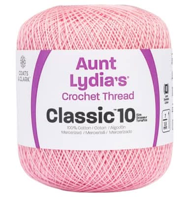 Get Aunt Lydia's Size 10 Classic Cotton Crochet Thread at Michaels. Made from high luster mercerized cotton, Aunt Lydia's crochet thread is the perfect choice for wardrobe essentials as well as home decor projects. You can use it to knit a cute doily or make a tea cozy. Available in multiple colors and lengths . 3 ply . Mercerized cotton . Recommended crochet hook: US - 7 (1.5 mm) . Aunt Lydia's Size 10 Classic Cotton Crochet Thread • Color: Orchid pink • Size: Size 10