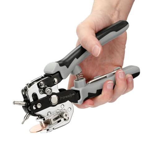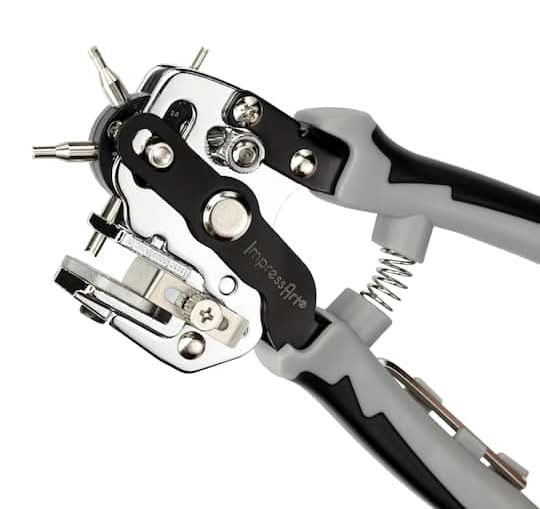 Buy the Impress Art 6-Size Metal Hole Punch at Michaels. Save your labor for bigger projects with this handy hole punch. This tool makes holes from 2 mm up to 4.5 mm in metal, leather, fabric, plastic and more. Hole diameters: 2 mm, 2.5 mm, 3 mm, 3.5 mm, 4 mm and 4.5 mm). Adjustable hole depth from 7 mm to 21 mm. Alloy steel and rubber. ImpressArt 6-Size Metal Hole Punch Size: Size 6
