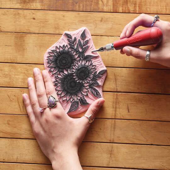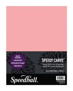 This block is made of a pink, eraser-like material that makes carving a breeze! It allows for easy transfers of images from ink-jet printers, clip art and newspapers—and mounts easily on wood or acrylic.. Available in multiple sizes. Carving block for block printing. Latex free. Speedball Speedy Carve Block • Color: Pink • Size: 9x11.5 in