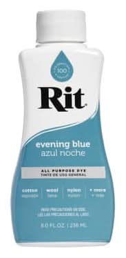 Rit Dye Liquid Evening Blue is a versatile, non-toxic liquid dye designed for easy application across a variety of materials. It is suitable for enhancing or changing the color of textiles made from cotton, linen, silk, wool, rayon, and nylon. Additionally, this dye can be applied to non-fabric items such as wood, wicker, paper, and cork. It facilitates a range of creative dyeing techniques including ombre, tie-dye, dip dyeing, marbling, and shibori. Rit Dye Liquid Evening Blue comes in a pre-mixed concentrated liquid form, allowing flexibility in project size and storage for future use. It can be applied using various methods such as in a washing machine, a plastic container, or a stainless steel sink, simplifying the dyeing process. Color: Evening blue