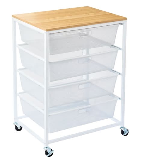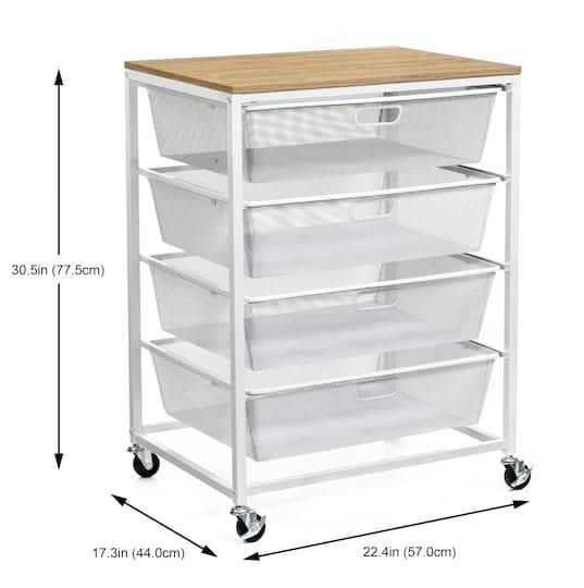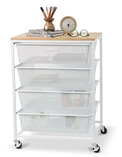 Find the Metro 4-Drawer Rolling Cart by Simply Tidy at Michaels. It features drawers with plenty of room for all your project needs and is mounted on four swivel casters, which makes moving the entire cart from room to room a breeze. The large table workspace will provide an extra surface sure to come in handy for your bigger projects. Available in multiple colors . 4 mesh drawers . 4 wheels (2 locking) . Metal, particle board and plastic . Hardware included . Adult assembly required Color: White