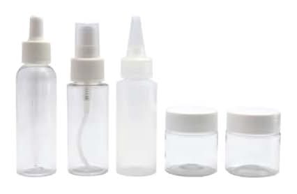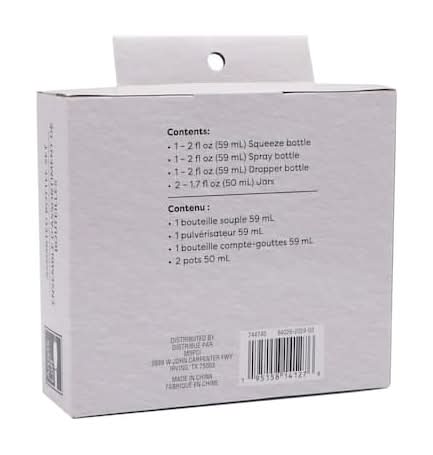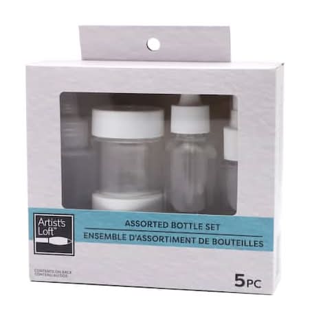 Use this bottle set from Artist's Loft to hold a variety of art liquids. Use the spray bottle for water or thinner, the droppers for paints, and the jars are ideal for mixing paints and mediums. Clear . 5 pieces . Plastic . 1 squeeze bottle (2 fl. oz., 59 mL) 1 spray bottle (2 fl. oz., 59 mL) . 1 spray bottle (2 fl. oz., 59 mL) 1 dropper bottle (2 fl. oz., 59 mL) . 1 dropper bottle (2 fl. oz., 59 mL) 2 jars (1.7 fl. oz., 50 mL) Color: Clear