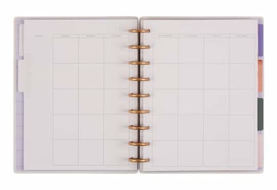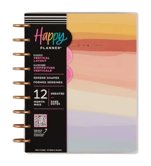 Buy The Classic Happy Planner Serene Shapes at Michaels. This Classic sized planner includes 12 undated spreads and features 12 dividers with designs featuring modern designs with an artistic finish and plant-inspired designs.. 7" x 9.25" (17.8cm x 23.5cm) approximate page size . Vertical layout . Disc bound . 12 months (undated) . Monthly and weekly layouts, dividers and one sticker sheet . The Classic Happy Planner Serene Shapes