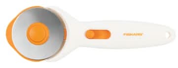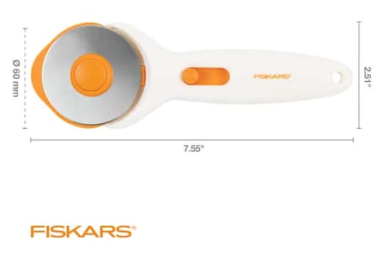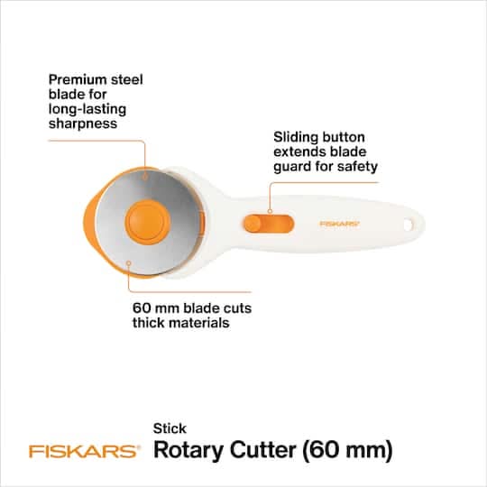 Ideal for cutting thicker materials including batting, foam and multiple layers of fabric like canvas, denim and leather, the Fiskars Stick Rotary Cutter features a high-grade, precision-ground, premium steel blade for long-lasting sharpness. White and orange handle . 60 mm blade diameter . 7.55" x 2.51" (19.18cm x 6.38cm) overall tool size . 10 mm blade exposure from multiple angles when in use . High-grade, precision ground, premium steel rotary blade . Safety guard with sliding button . Size: 60mm
