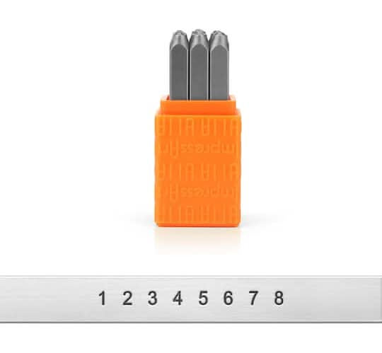 This number stamping set from Impress Art is a must-have tool for your metal stamping projects. 1.5 mm . 9 metal stamps . Numbered from 0 - 8 (6 used for 9) . Sans serif font, similar to Arial . For stamping soft metals, including aluminum, pewter, alkeme, copper, brass and nickel silver . ImpressArt Sans Serif Number Metal Stamp Set Color: None
