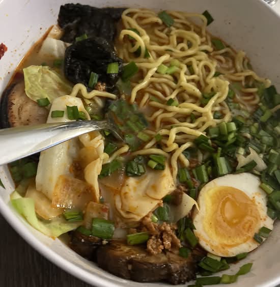 Rich golden chicken broth with wavy flat flour noodles, ground pork, onion, half soft boiled egg, cabbage, chives, and sliced pork chashu.