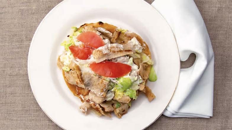 1 LB. of eat, 2 Pitas, lettuce, tomato, onion and gyro sauce with a side of fries. Are served with onion, tomato and gyro sauce.