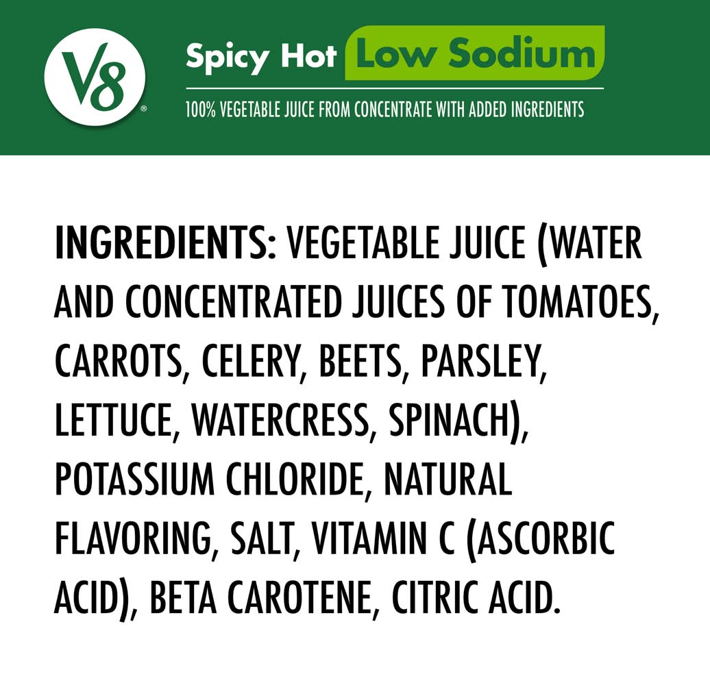 Savor the plant based goodness of V8 Low Sodium Spicy Hot 100% Vegetable Juice. A satisfying alternative to other juices, this spicy V8 juice is made with concentrated tomato juice along with the juices of seven other vegetables. The result is a 100% juice with the perfect amount of spice and 78% less sodium than the original. Delicious and nutritious, V8 vegetable juice is an easy way to get your daily recommended veggies. Each 8 fl oz serving contains 2 servings of vegetables and is an excellent source of Vitamins A and C. Our veggie juice is also gluten free and non GMO with no sugar added.* Enjoy V8 Spicy Hot Vegetable Juice on its own, over ice, or seasoned with pepper and adorned with your favorite garnishes. It’s great as a breakfast drink, afternoon snack, or post workout drink. In addition to sipping it as a vegetable drink, you can also use V8 to add flavor and nutrition to a variety of dishes. Try it as a vegetable soup base, substitute it for broth, or use it as a marinade. (*Not a low calorie food; see nutrition panel for sugar and calorie content)