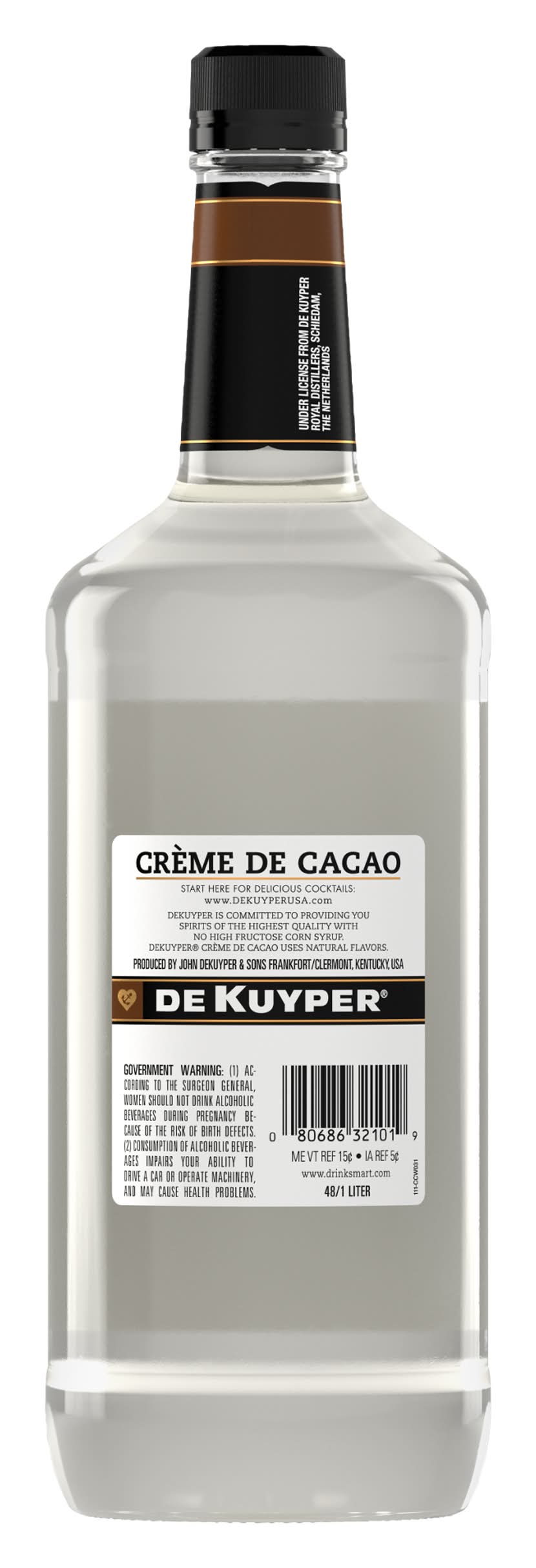 DeKuyper Crème de Cocoa White offers all the tempting taste of chocolate in an intensely flavored liqueur. Offering a rich nose of cocoa aroma with a hint of butter, this chocolate liqueur is an essential ingredient to rich, creamy cocktails. While this clear liqueur is slightly less bitter than its dark counterpart, its flavor is unmistakably sweet chocolate. Perfect for after-dinner cocktails, shake it up with ice, crème de menthe green and light cream for a colorful, refreshing Grasshopper Martini. With a heritage dating back more than 300 years, DeKuyper Cordials & Liqueurs continues to be on the cutting edge of the spirits industry. DeKuyper's evolution has been successful through the combination of its rich, traditional expertise and modern innovation, creating mixable and versatile cordials, liqueurs, crèmes, brandies and schnapps made from the world's finest ingredients. DeKuyper has been the brand bartenders trust to add color, flavor and fun to any cocktail. Alcohol by volume: 24%