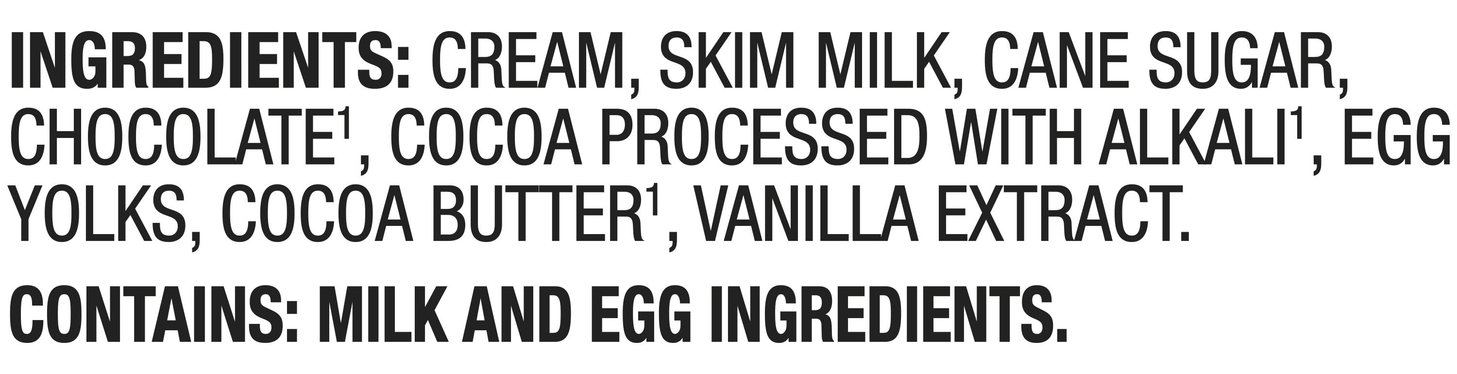 Ingredients: Cream, Skim Milk, Cane Sugar, Chocolate, Cocoa Processed with Alkali, Egg Yolks, Cocoa Butter, Vanilla Extract Contains: Milk, Eggs, Soybeans