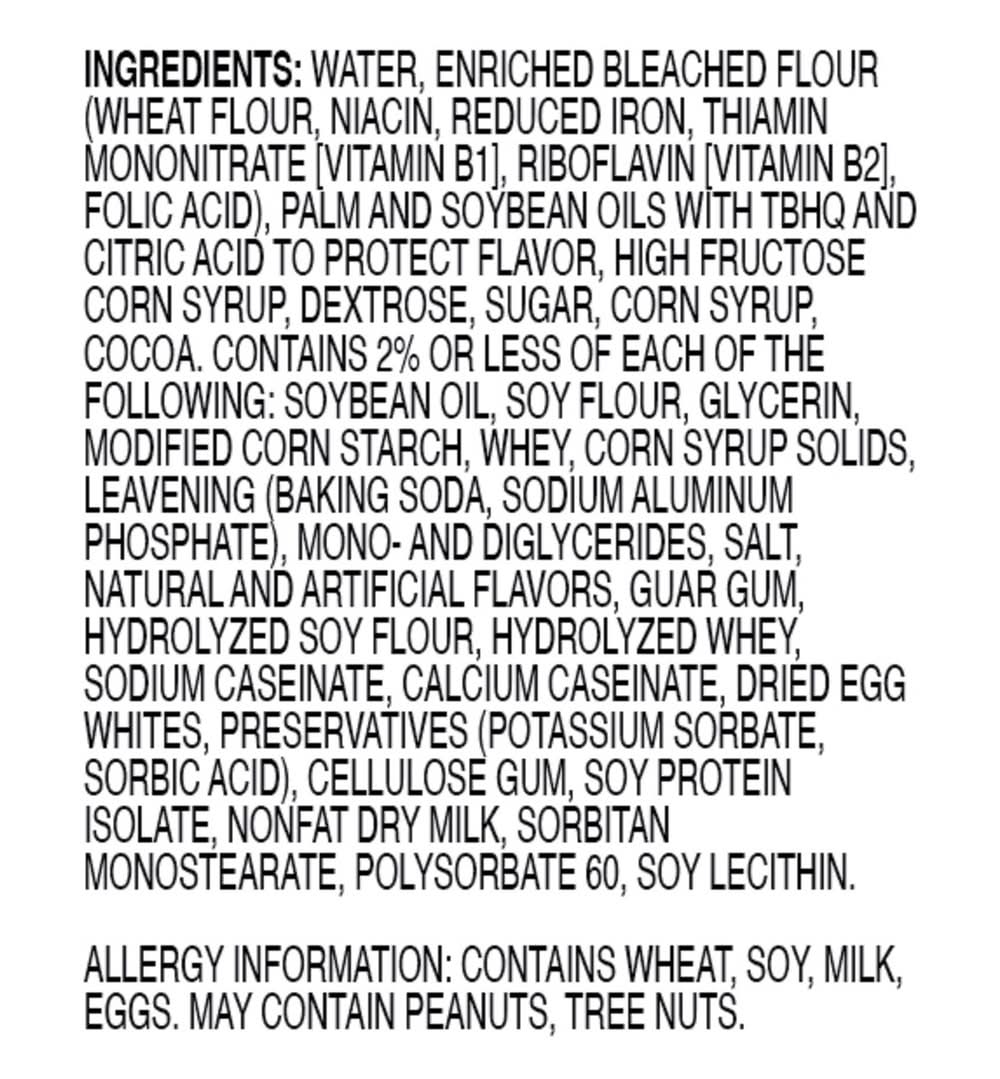Ingredients: Water, Enriched Bleached Flour (Wheat Flour, Niacin, Reduced Iron, Thiamin Mononitrate [Vitamin B1], Riboflavin [Vitamin B2], Folic Acid), Palm and Soybean Oils with TBHQ and Citric Acid to Protect Flavor, High Fructose Corn Syrup, Dextrose, Sugar, Corn Syrup, Cocoa, Contains 2% or Less of Each of the Following: Soybean Oil, Soy Flour, Glycerin, Modified Corn Starch, Whey, Corn Syrup Solids, Leavening (Baking Soda, Sodium Aluminum Phosphate), Mono- and Diglycerides, Salt, Natural and Artificial Flavors, Guar Gum, Hydrolyzed Soy Flour, Hydrolyzed Whey, Sodium Caseinate, Calcium Caseinate, Dried Egg Whites, Preservatives (Potassium Sorbate, Sorbic Acid), Cellulose Gum, Soy Protein Isolate, Nonfat Dry Milk, Sorbitan Monostearate, Polysorbate 60, Soy Lecithin Contains: Wheat, Soybeans, Milk, Eggs, Peanuts, Tree Nuts