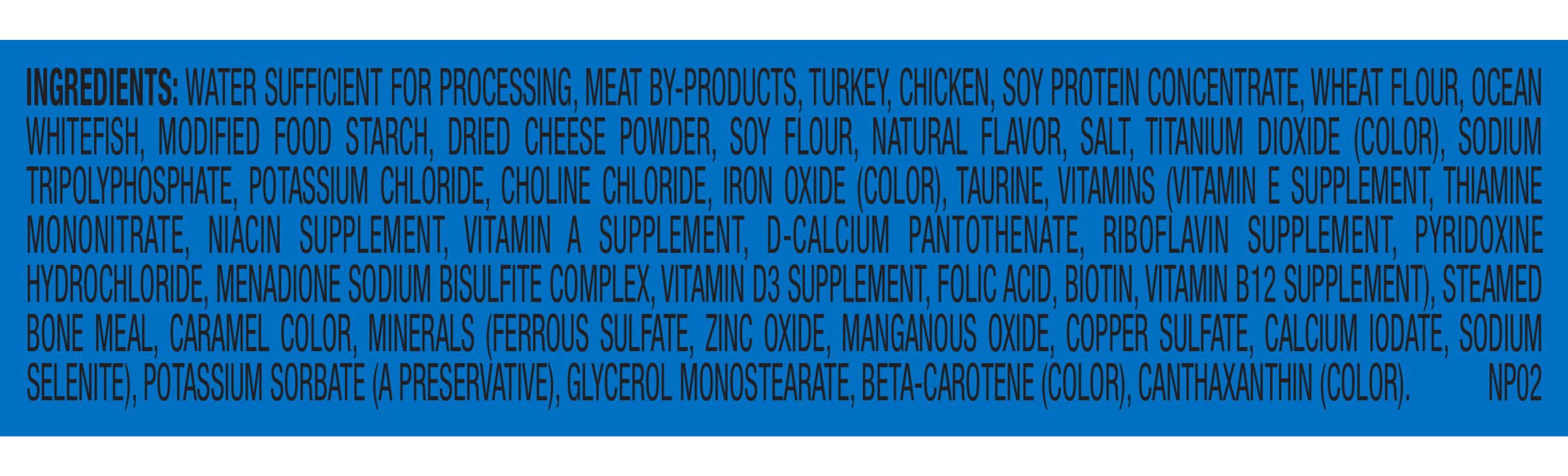 Ingredients: Water Sufficient For Processing, Turkey, Chicken, Liver, Meat By-products, Soy Flour, Wheat Gluten, Modified Food Starch, Dried Cheese Powder, Wheat Flour, Natural Flavor, Salt, Titanium Dioxide (color), Sodium Tripolyphosphate, Potassium Chloride, Calcium Carbonate, Iron Oxide (color), Vitamins (vitamin E Supplement, Thiamine Mononitrate, Niacin, Vitamin A Supplement, D-calcium Pantothenate, Riboflavin Supplement, Pyridoxine Hydrochloride, Vitamin B12 Supplement, Menadione Sodium Bisulfite Complex, Vitamin D3 Supplement, Folic Acid, Biotin), Choline Chloride, Taurine, Caramel Color, Bone Phosphate, Minerals (ferrous Sulfate, Zinc Oxide, Manganous Oxide, Copper Sulfate, Calcium Iodate, Sodium Selenite), Thiamine Mononitrate, Potassium Sorbate (preservative), Glyceryl Monostearate, Beta Carotene (color), Canthaxanthin (color)