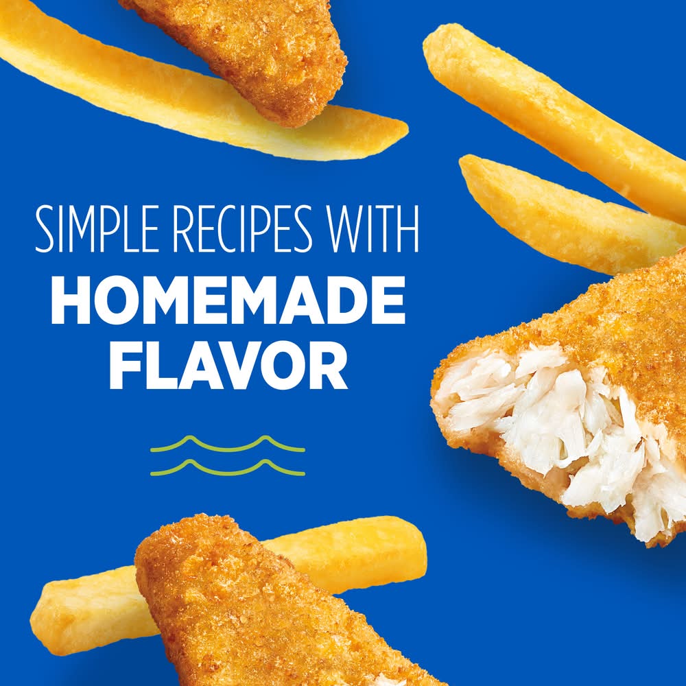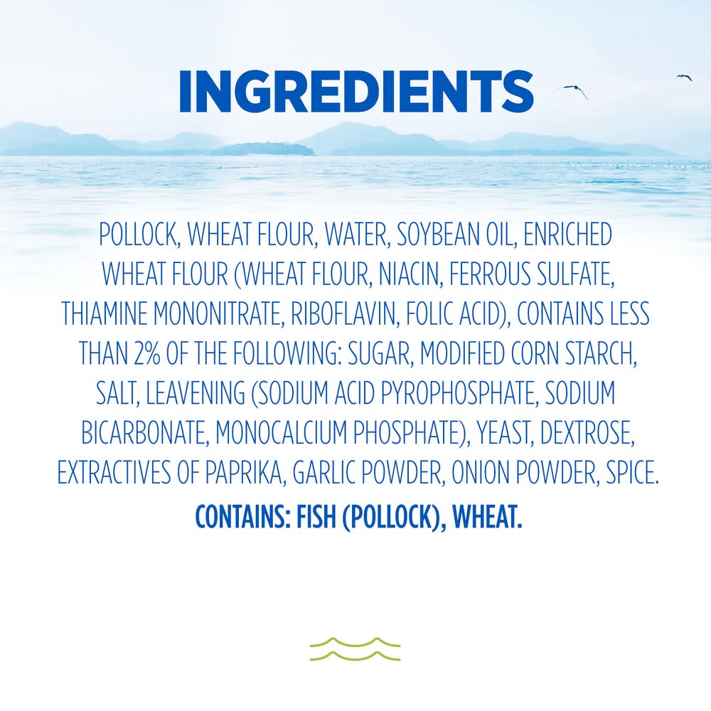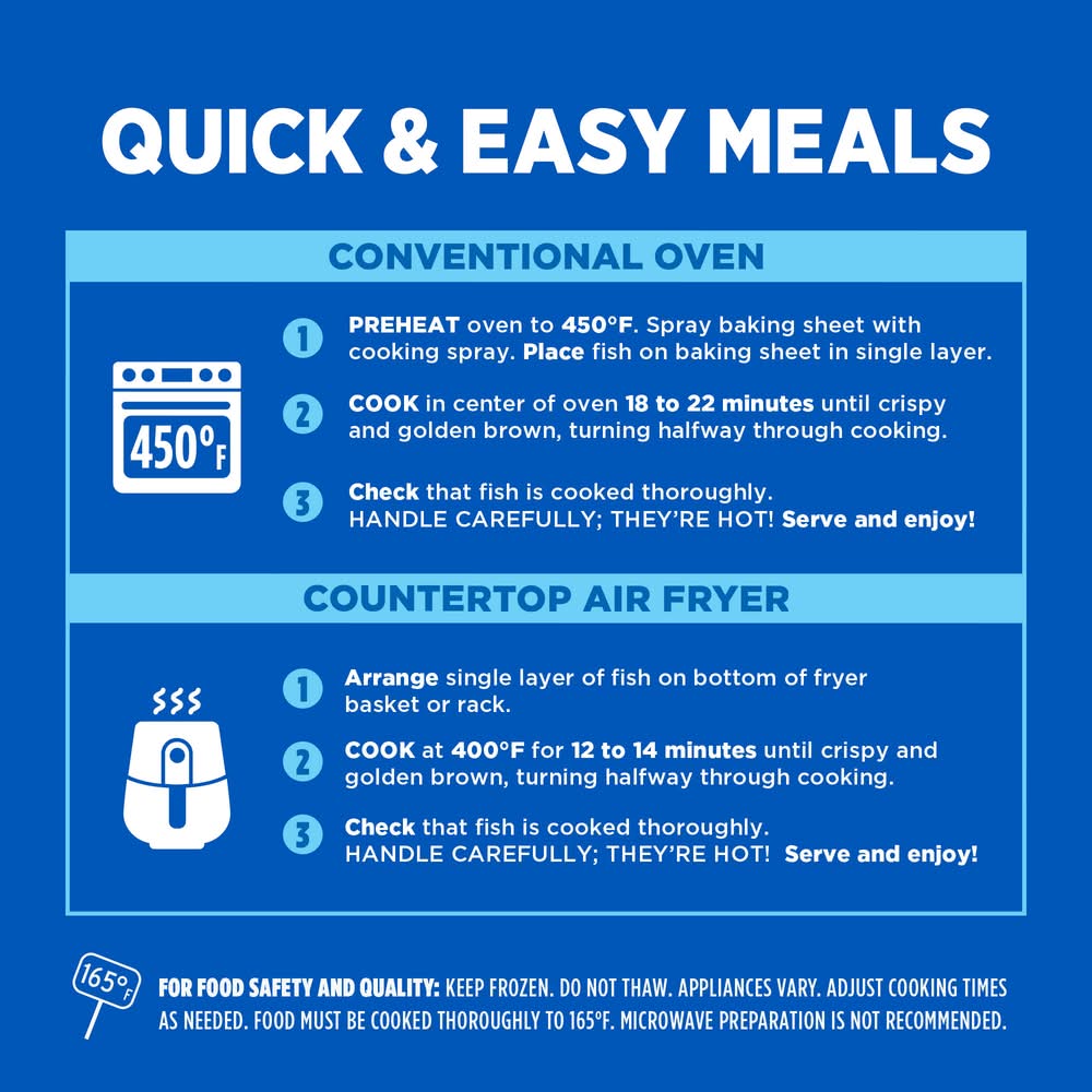 Directions for use: Conventional Oven: 1. Preheat oven to 450 degrees F. Spray large baking sheet with cooking spray. 2. Remove fish from carton and inner wrapper. Place on baking sheet in single layer. 3. Bake 18 to 22 minutes until crispy and golden brown, turning halfway through cooking time. Check that fish is cooked thoroughly. Handle carefully; they're hot! Serve and enjoy! Countertop Air Fryer: 1. Arrange single layer of fish on bottom of fryer basket or rack. 2. Cook of 400 degrees F for 12 to 14 minutes until crispy and golden brown. For more even browning, turn halfway through cooking time. 3. Check that fish is coked thoroughly. Handle carefully; they're hot! Serve and enjoy! For Food Safety and Quality: Keep frozen. Do no thaw. Appliances vary. Adjust cooking times as needed. Food must be cooked thoroughly to 165 degrees F. Microwave preparation is not recommended. Keep frozen. Storage recommendation: Keep frozen.