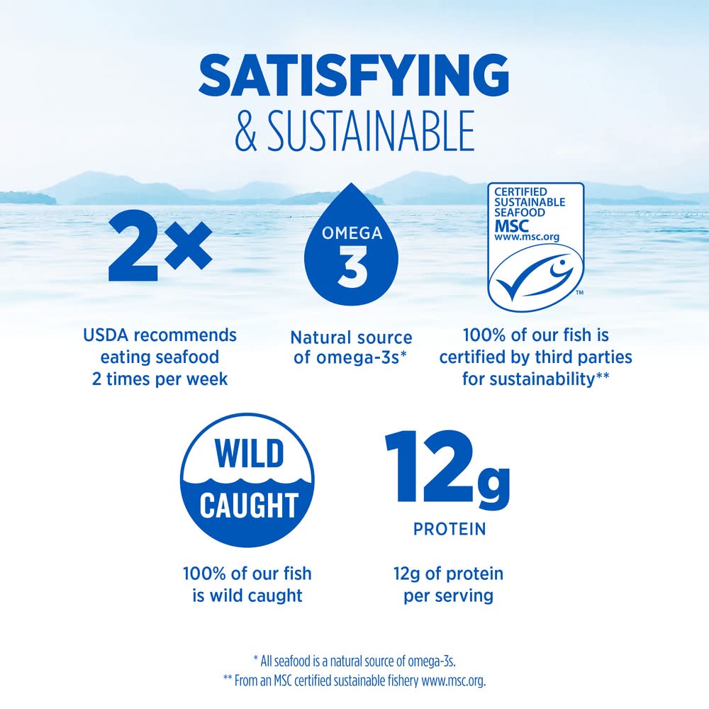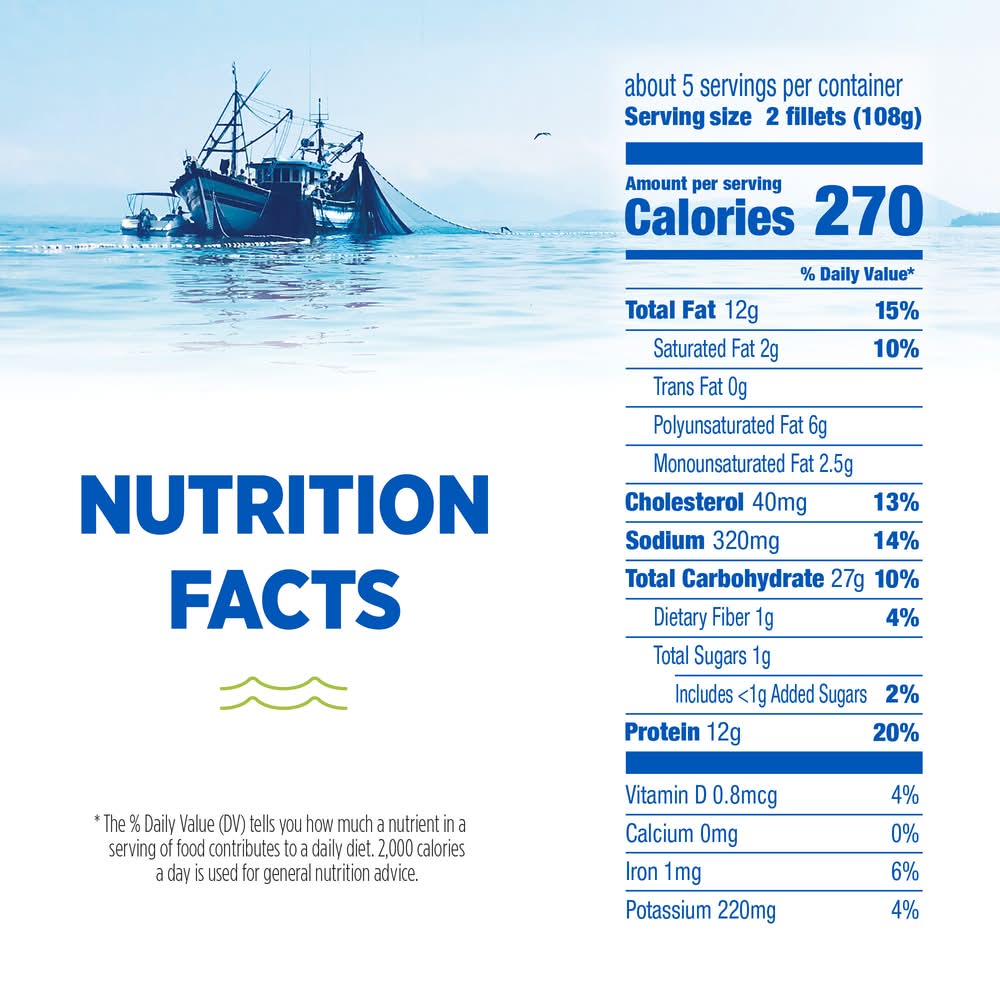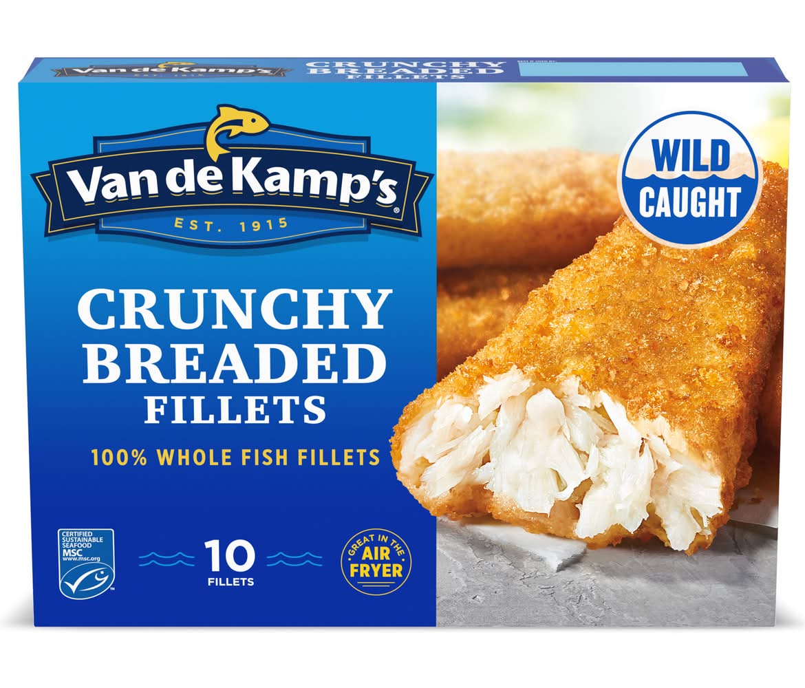 Nothing is better than a delicious fish sandwich made with Van de Kamp's Crunchy Breaded Fish Sandwich Fillets, made with 100% Whole fish. This mouthwatering, wild-caught pollock is surrounded by a golden breading that is the perfect combination of flavor and crispiness. Whether you prefer adding them to a tasty bun with your favorite veggies, drenching them in tartar sauce or simply eating them all by themselves, you will love these tasty fish sandwich fillets. Easily prepared in the air fryer or the oven, they're a natural source of Omega-3s*, are a good source of protein, with 8 grams per serving, and are certified sustainable seafood** so you'll feel good about what you're feeding your family. * All fish is a good source of Omega 3s ** 100% of our fish is certified by a third party for sustainability from an MSC certified sustainable fishery • Number of servings: 8 • Conagra Brands, Chicago, IL, 60654 • Packaging: Reusable