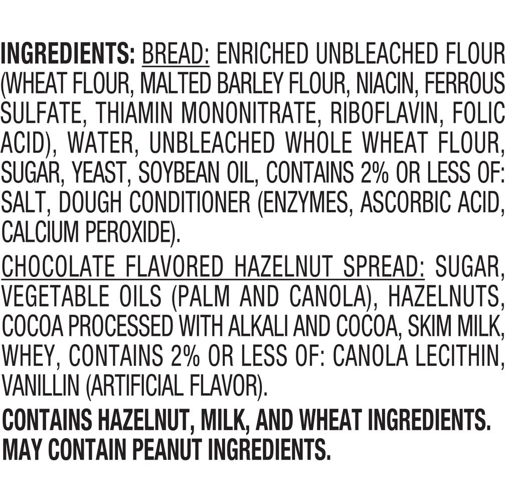Ingredients: Bread: Enriched Unbleached Flour (Wheat Flour, Malted Barley Flour, Niacin, Ferrous Sulfate, Thiamin Mononitrate, Riboflavin, Folic Acid), Water, Unbleached Whole Wheat Flour, Sugar, Yeast, Soybean Oil, Contains 2% Or Less Of: Salt, Dough Conditioner (Enzymes, Ascorbic Acid, Calcium Peroxide). Chocolate Flavored Hazelnut Spread: Sugar, Vegetable Oils (Palm And Canola), Hazelnuts, Cocoa Processed With Alkali And Cocoa, Skim Milk, Whey, Contains 2% Or Less Of: Canola Lecithin, Vanillin (Artificial Flavor). Contains: Contains Milk, Hazelnut And Wheat Ingredients. May Contain Peanut Ingredients.
