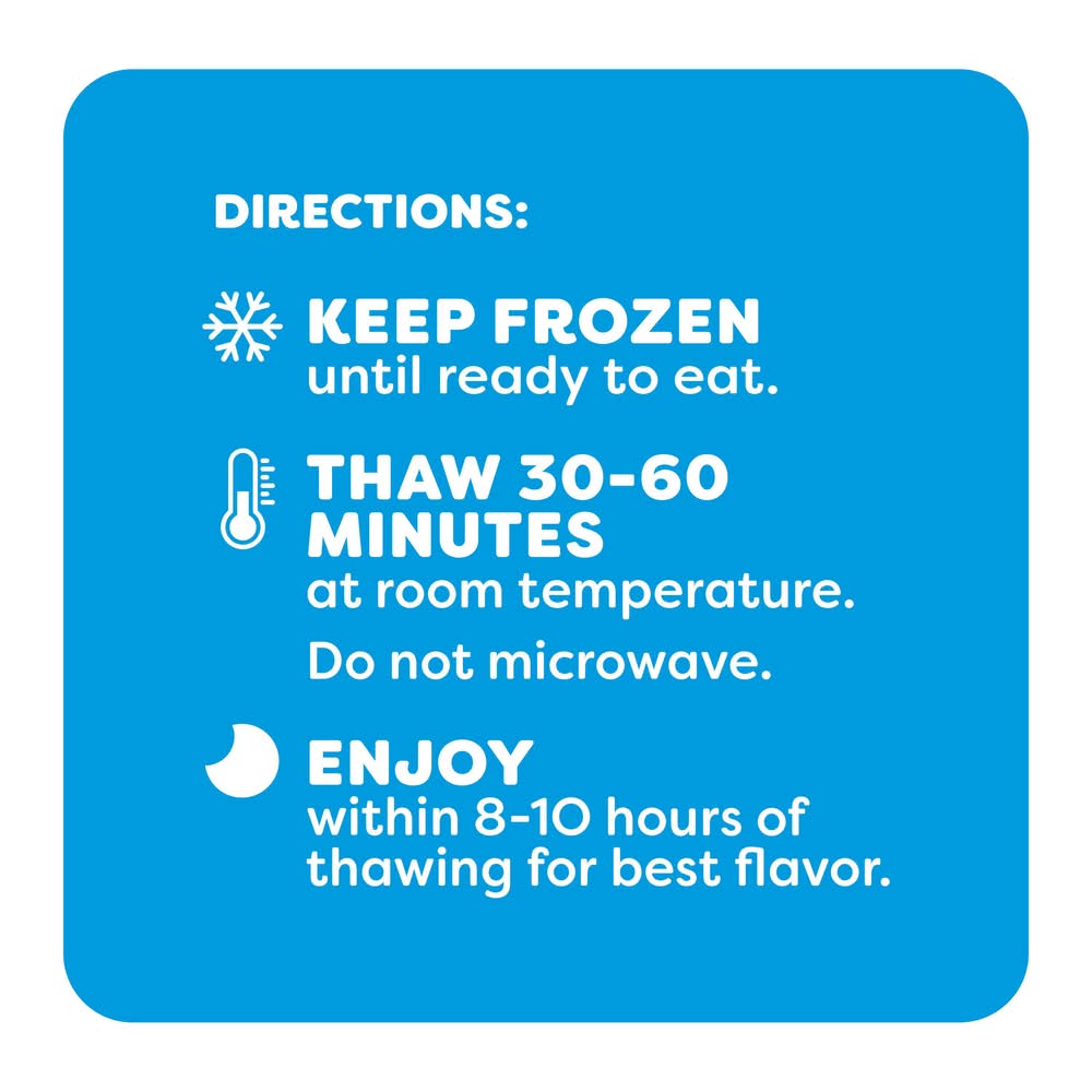 Directions: thaw 30-60 minutes. eat within 8-10 hours. do not microwave.