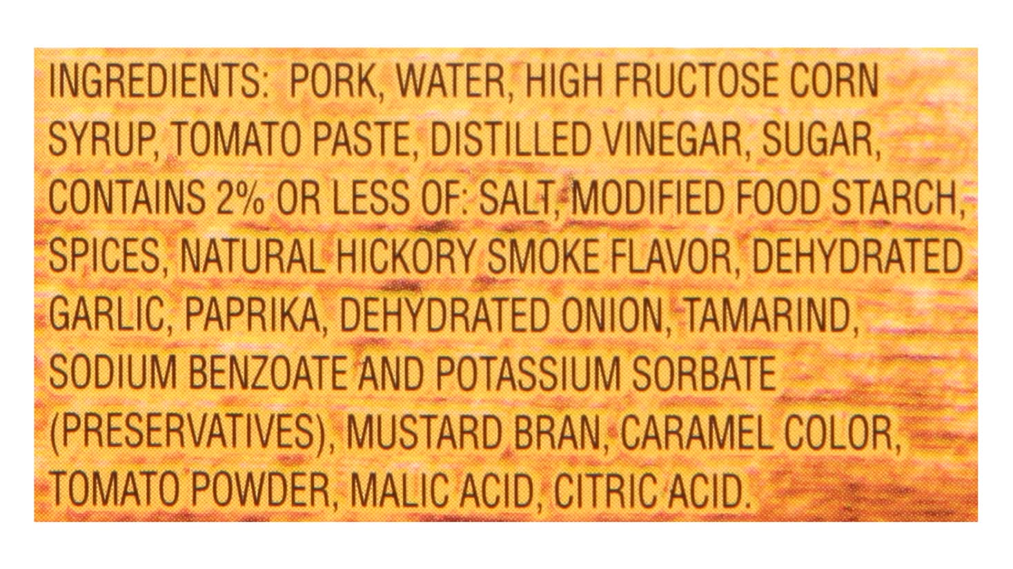 Ingredients: Pork, Water, High Fructose Corn Syrup, Tomato Paste, Distilled Vinegar, Sugar, Contains 2% or Less of: Salt, Modified Food Starch, Spices, Natural Hickory Smoke Flavor, Dehydrated Garlic, Paprika, Dehydrated Onion, Tamarind, Sodium Benzoate and Potassium Sorbate (Preservatives), Mustard Bran, Caramel Color, Tomato Powder, Malic Acid, Citric Acid
