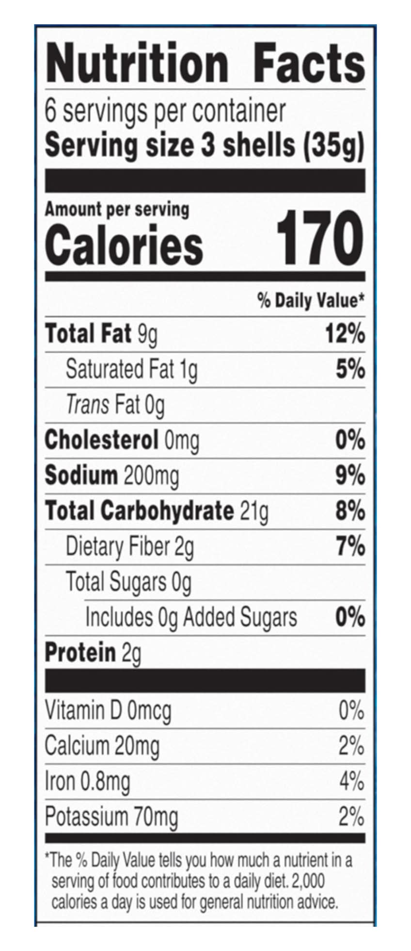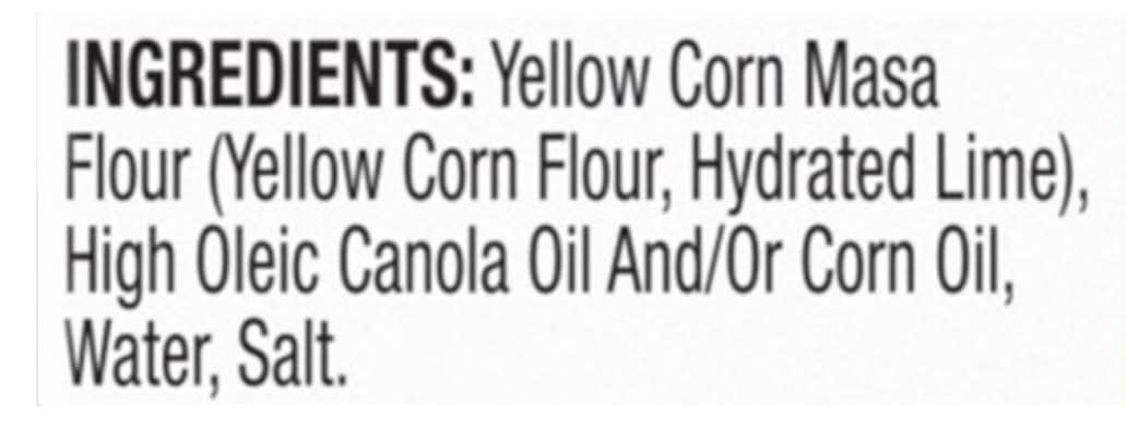 Ingredients: Yellow Corn Masa Flour (Yellow Corn Flour, Hydrated Lime), High Oleic Canola Oil and/or Corn Oil, Water, Salt Contains: Corn