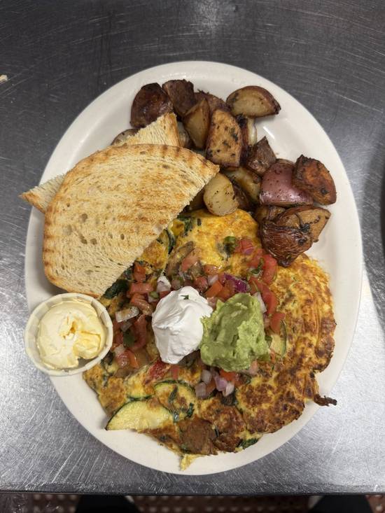 PLANT BASED EGGS OR TOFU EGGS SCRAMBLED WITH OUR HOUSE BLEND VEGGIES AND VEGAN CHEESE. TOPPED WITH FRESH SALSA, GUACAMOLE, AND VEGAN SOUR CREAM. SERVED WITH TOAST.