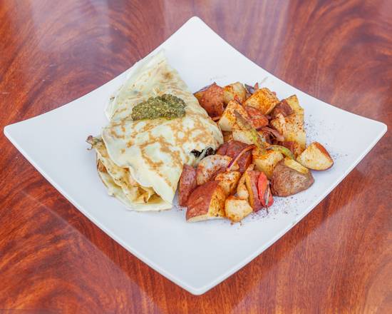 One crepe with mushrooms, purple onion, tomato, pesto, chicken, and mozzarella cheese. Consuming raw or undercooked meats, poultry, seafood, shellfish, or eggs may increase your risk of foodborne illness especially if you have certain medical conditions.