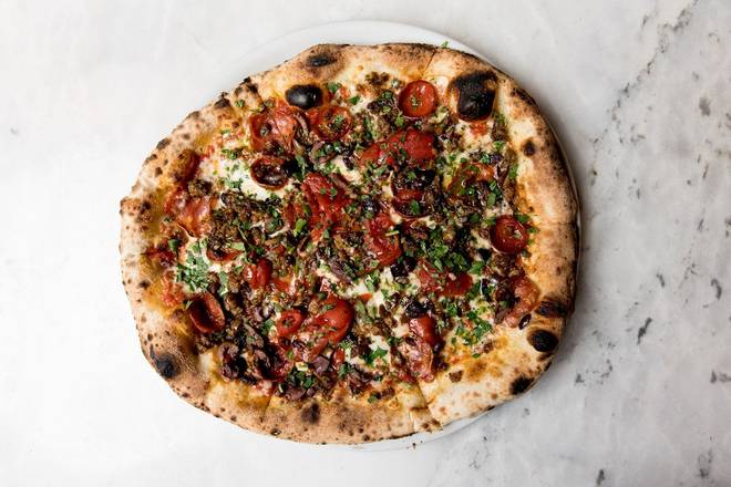 Mozzarella, salami, Italian fennel sausage, pepperoni, kalamata olives, Alta Cucina tomatoes, fresh herbs.