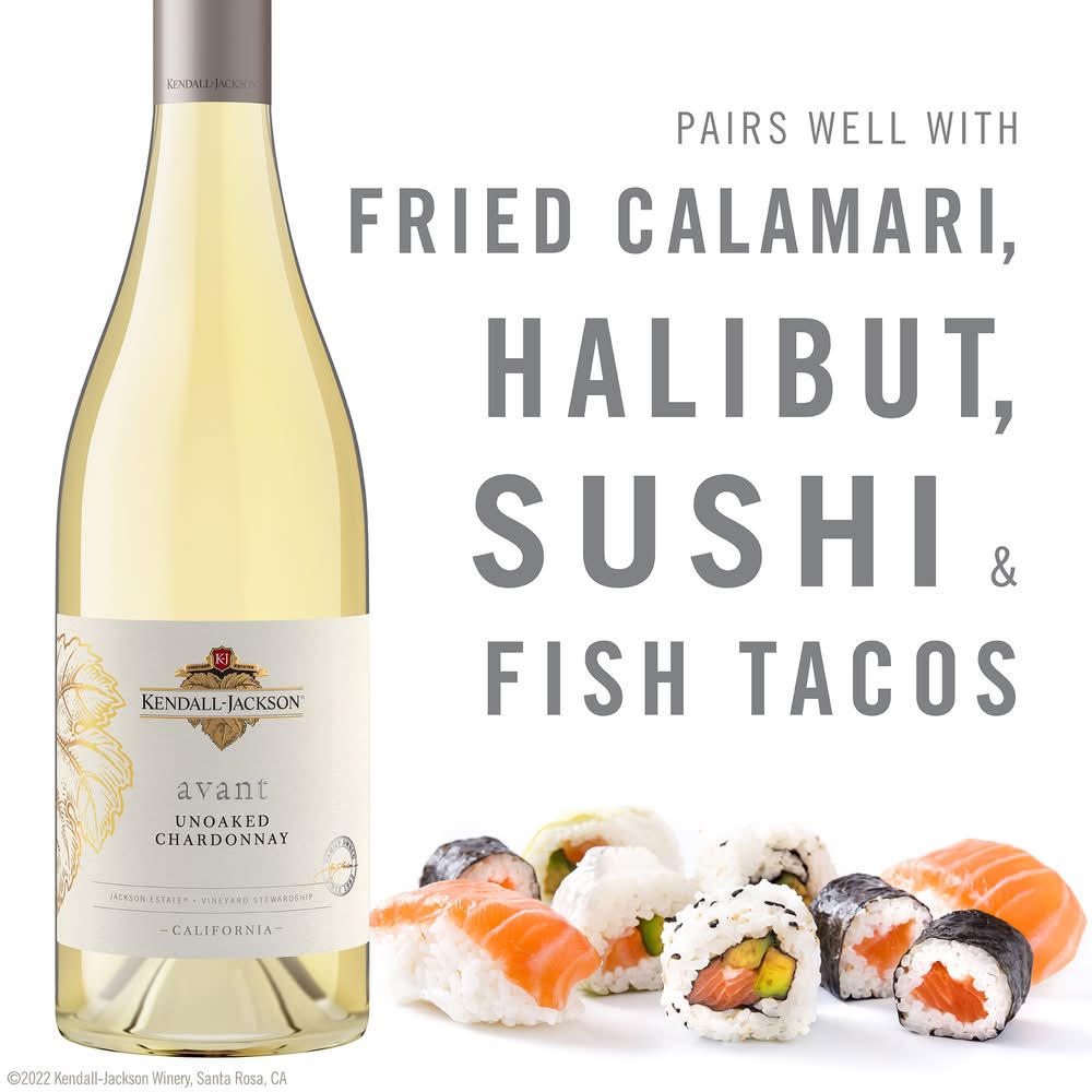 Kendall-Jackson Avant Unoaked Chardonnay White Wine is primarily sourced from California’s Monterey County, Santa Barbara County and Mendocino County. This Kendall-Jackson Chardonnay wine combines crisp green apple, citrus and tropical fruit notes for the perfect dry white wine that is a superb accompaniment for food. It also has flavors and aromas of pineapple, juicy pear and wildflowers. This youthful and lively California Chardonnay is handcrafted to be expressive, fruit forward and vibrant. It is 100% stainless steel fermented with a screw cap closure helps to preserve the aromatic freshness and youthfulness of the wine. Pair this white wine Chardonnay with sushi, halibut, fried calamari and fish tacos for an excellent meal. Kendall-Jackson is committed to producing only the finest quality wines from Chardonnay grape varietals grown in California. One aspect that distinguishes a Kendall-Jackson Chardonnay is vineyard sourcing. The majority of fruit sourced for Kendall-Jackson wines is grown on the 12,000 acres of estate vineyards owned by the Jackson family. All of the estate vineyards are certified sustainable by the CCSW (Certified California Sustainable Winegrowing) program and Kendall-Jackson is a Gold Member of IWCA (International Wineries for Climate Action). The proprietary approach to winemaking has earned Kendall-Jackson a world-renowned reputation for white wines that consistently exhibit signature rich layers of flavor, combined with a delicate balance. This bottled wine has a 13.5% ABV. • Alcohol by volume: 13.5% • 2016