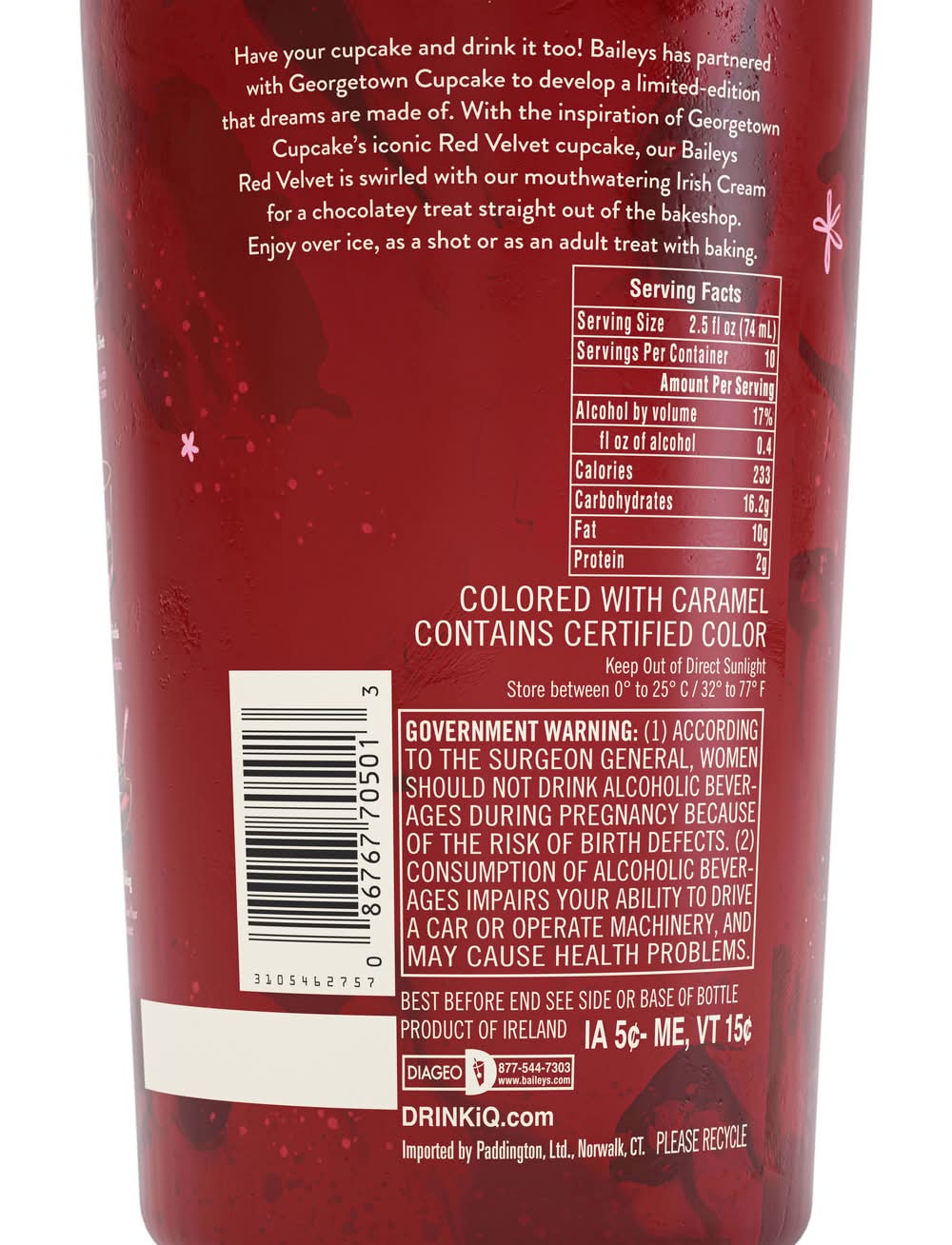 Directions: cupcake shot: 2 oz. bailey's red velvet topped with whipped cream. on the rocks: 2 oz. bailey's red velvet on the rocks. festive baking: 2 oz baileys red velvet poured over your favorite dessert. keep out of direct sunlight. store between 32 degrees to 77 degrees f (0 degrees to 25 degrees c). best before end see side or base of bottle.
