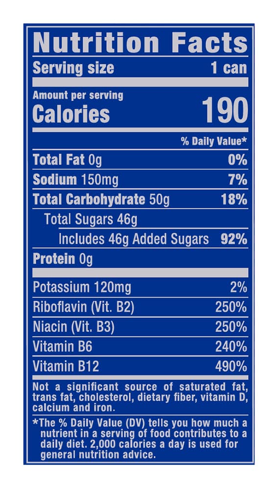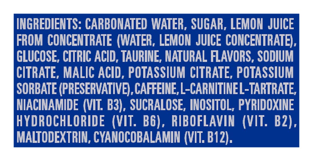 Ingredients: Carbonated Water, Sugar, Lemon Juice from Concentrate (Water, Lemon Juice Concentrate), Glucose, Citric Acid, Taurine, Natural Flavors, Sodium Citrate, Malic Acid, Potassium Citrate, Potassium Sorbate (Preservative), Caffeine, L-Carnitine L-Tartrate, Niacinamide (Vit. B3), Sucralose, Inositol, Pyridoxine Hydrochloride (Vit. B6), Riboflavin (Vit. B2), Maltodextrin, Cyanocobalamin (Vit. B12) Contains 180mg of caffeine
