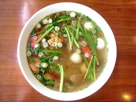 Rice noodle with pork, shrimp , crab stick, and quail egg.