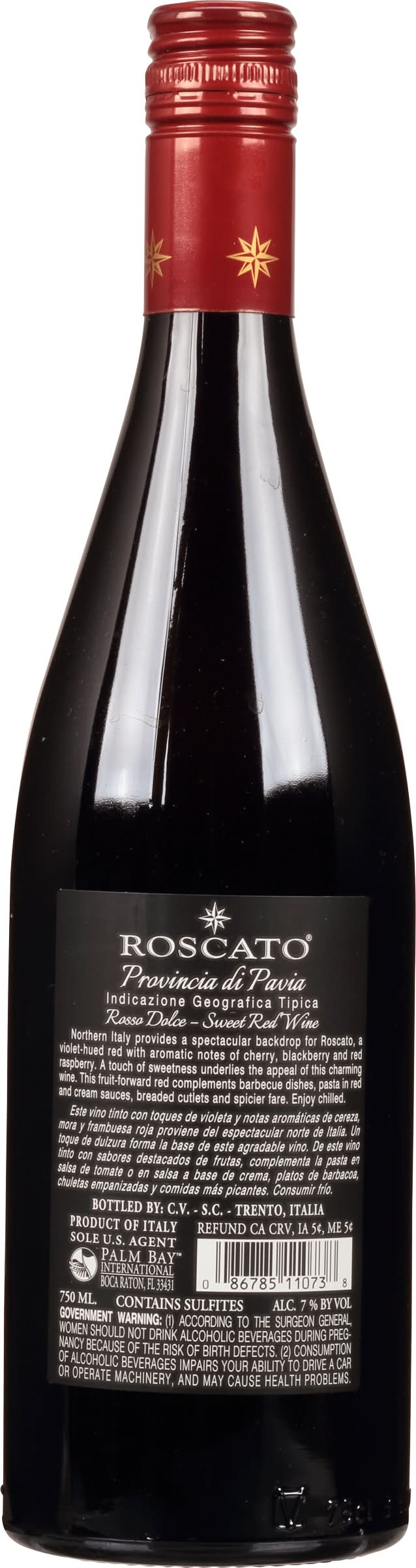 A violet-hued beverage with aromatic notes of cherry, blackberry, and red raspberry. Originating from Northern Italy, this charming wine offers a subtle sweetness and pairs well with barbecue dishes, various pastas, breaded cutlets, and spicier cuisine. • Brand: Roscato • Alcohol by volume: 7% • Palm Bay International, Boca Raton, FL 33431