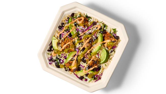 cilantro lime brown rice, cabbage, blackened chicken, avocado, cotija, black beans, chipotle crema, salsa verde, lime squeeze *We can't guarantee items are allergen free. All drizzles served on top