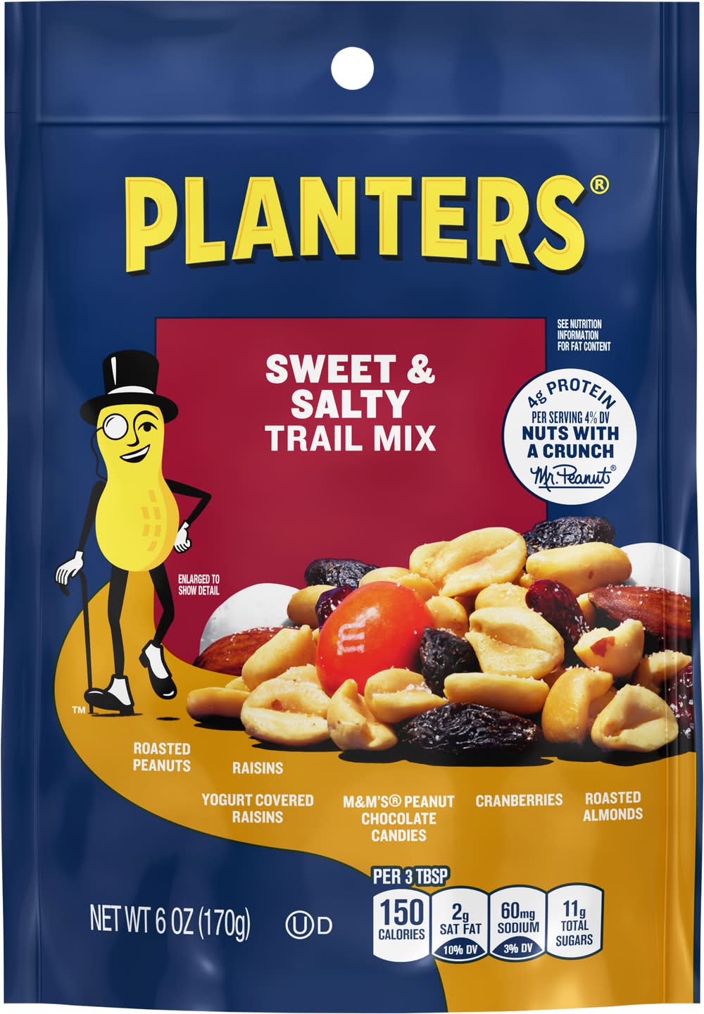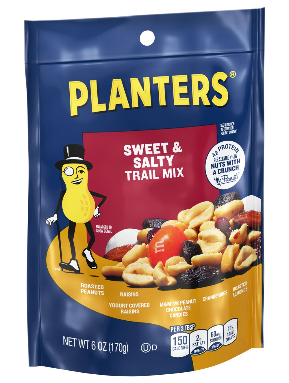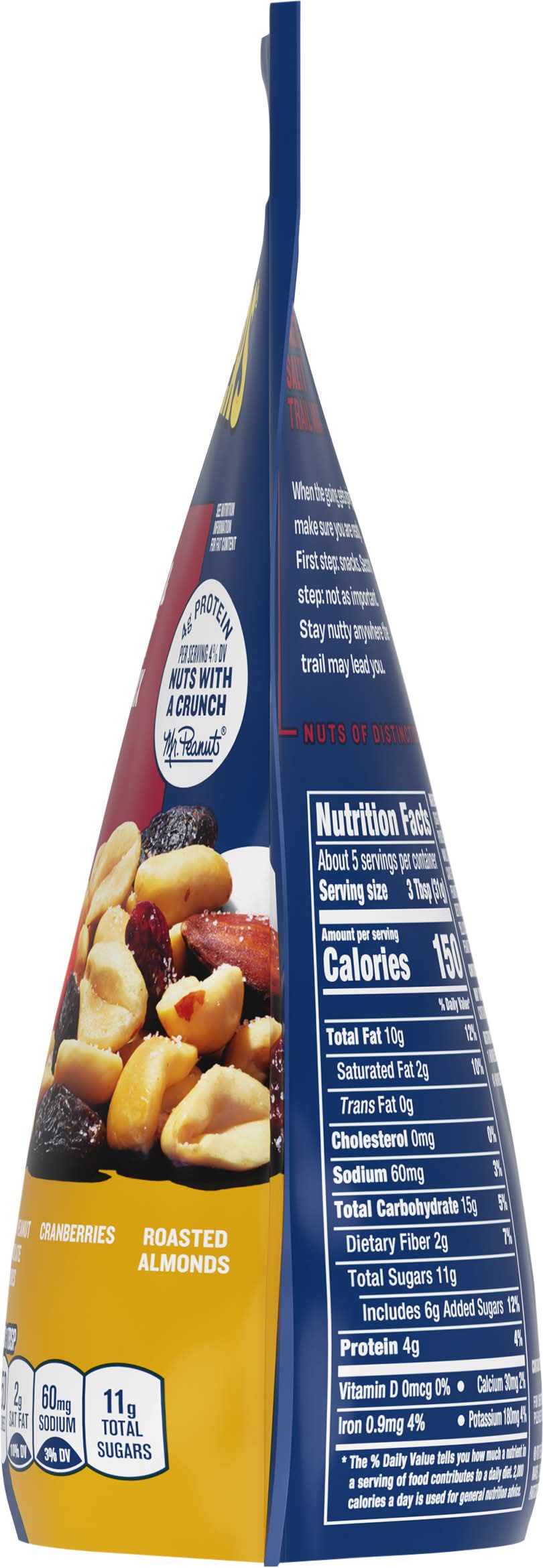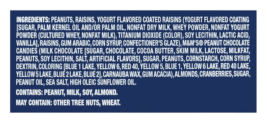 Ingredients: Peanuts, Raisins, Yogurt Flavored Coated Raisins (Yogurt Flavored Coating [Sugar, Palm Kernel Oil and/or Palm Oil, Nonfat Dry Milk, Whey Powder, Nonfat Yogurt Powder (Cultured Whey, Nonfat Milk), Titanium Dioxide (Color), Soy Lecithin, Lactic Acid, Vanilla], Raisins, Gum Arabic, Corn Syrup, Confectioner's Glaze), M&M's Peanut Chocolate Candies (Milk Chocolate [Sugar, Chocolate, Cocoa Butter, Skim Milk, Lactose, Milkfat, Peanuts, Soy Lecithin, Salt, Artificial Flavors], Sugar, Peanuts, Cornstarch, Corn Syrup, Dextrin, Coloring [Blue 1 Lake, Yellow 6, Red 40, Yellow 5, Blue 1, Yellow 6 Lake, Red 40 Lake, Yellow 5 Lake, Blue 2 Lake, Blue 2], Carnauba Wax, Gum Acacia), Almonds, Cranberries, Sugar, Peanut Oil, Sea Salt, High Oleic Sunflower Oil Contains: Peanuts, Milk, Soybeans, Tree Nuts, Almonds, Corn, Lactose, Tree Nuts, Wheat