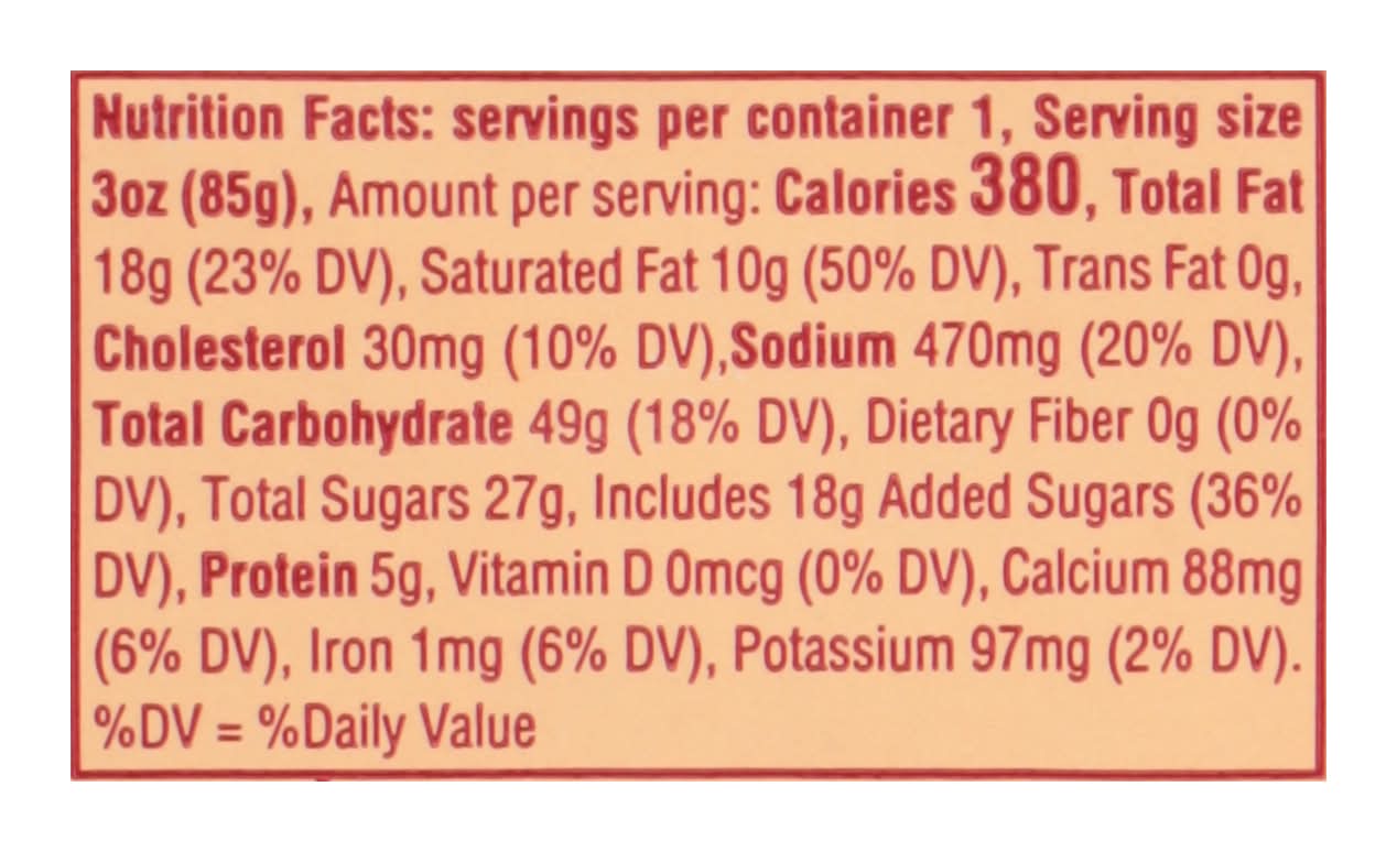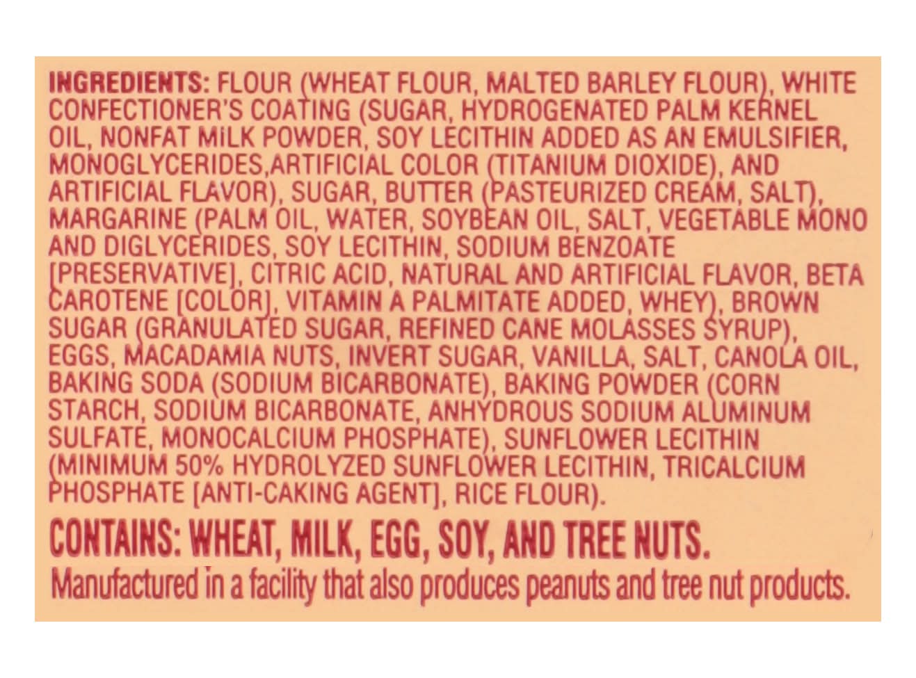 Ingredients: Flour (Wheat Flour, Malted Barley Flour), White Confectioner's Coating (Sugar, Hydrogenated Palm Kernel Oil, Nonfat Milk Powder, Soy Lecithin Added as an Emulsifier, Monoglycerides, Artificial Color (Titanium Dioxide), and Artificial Flavor), Sugar, Butter (Pasteurized Cream, Salt), Margarine (Palm Oil, Water, Soybean Oil, Salt, Vegetable Mono and Diglycerides, Soy Lecithin, Sodium Benzoate [Preservative], Citric Acid, Natural and Artificial Flavor, Beta Carotene [Color], Vitamin A Palmitate Added, Whey), Brown Sugar (Granulated Sugar, Refined Cane Molasses Syrup), Eggs, Macadamia Nuts, Invert Sugar, Vanilla, Salt, Canola Oil, Baking Soda (Sodium Bicarbonate), Baking Powder (Corn Starch, Sodium Bicarbonate, Anhydrous Sodium Aluminum Sulfate, Monocalcium Phosphate), Sunflower Lecithin (Minimum 50% Hydrolyzed Sunflower Lecithin, Tricalcium Phosphate (Anti-Caking Agent], Rice Flour) Contains: Wheat, Milk, Eggs, Soybeans, Tree Nuts, Barley, Tree Nuts, Macadamia Nuts, Peanuts, Tree Nuts
