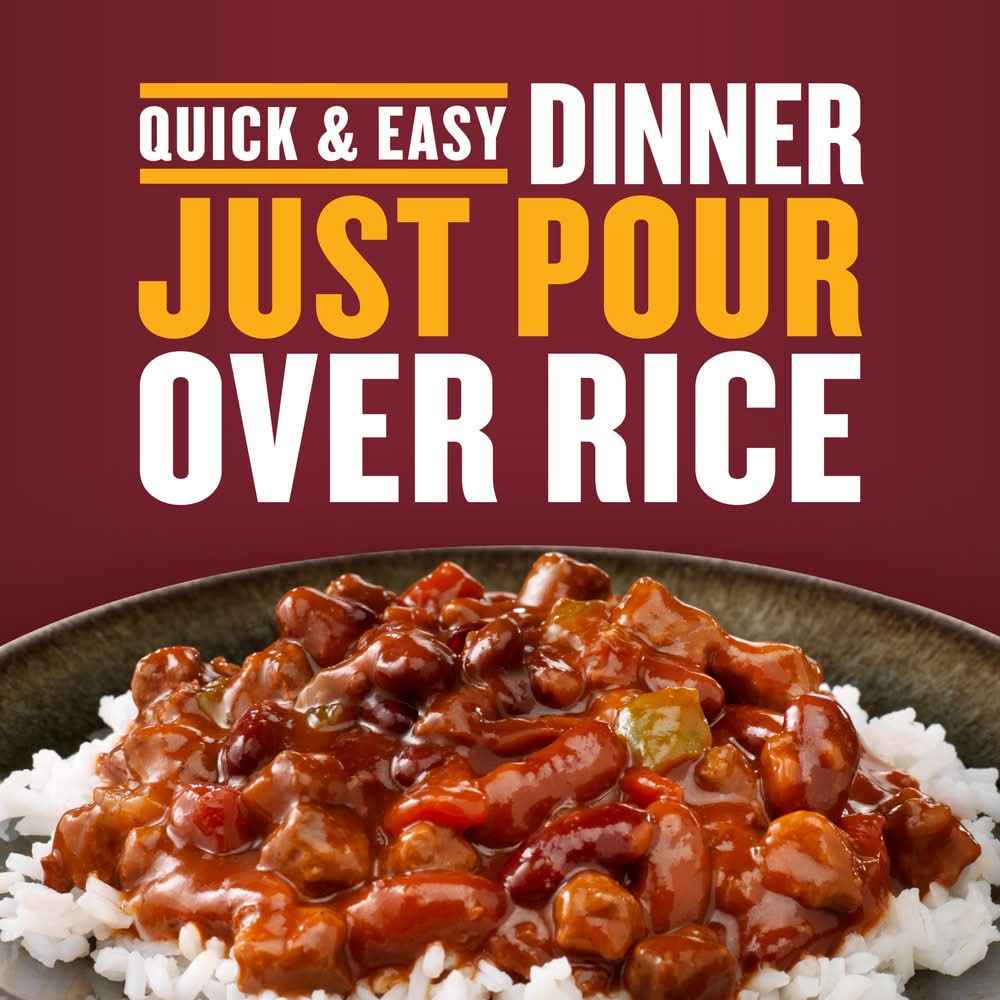 Ingredients: Water, Tomato Puree (Water, Tomato Paste), Kidney Beans, Seasoned Cooked Beef and Pork Crumble (Beef and Pork, Salt, Spice Extractive), Contains Less than 2% of: Green Peppers, Red Peppers, Modified Cornstarch, Spices, Soy Protein Concentrate, Dried Onions, Salt, Sugar, Dried Garlic, Paprika Contains: Soybeans, Corn, Wheat