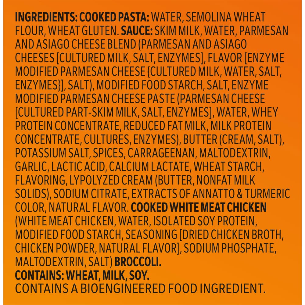 Ingredients: COOKED PASTA: WATER, SEMOLINA WHEAT FLOUR, WHEAT GLUTEN. SAUCE: SKIM MILK, WATER, PARMESAN AND ASIAGO CHEESE BLEND (PARMESAN AND ASIAGO CHEESES [CULTURED MILK, SALT, ENZYMES], FLAVOR [ENZYME MODIFIED PARMESAN CHEESE {CULTURED MILK, WATER, SALT, ENZYMES}], SALT), MODIFIED FOOD STARCH, SALT, ENZYME MODIFIED PARMESAN CHEESE PASTE (PARMESAN CHEESE [CULTURED PART-SKIM MILK, SALT, ENZYMES], WATER, WHEY PROTEIN CONCENTRATE, REDUCED FAT MILK, MILK PROTEIN CONCENTRATE, CULTURES, ENZYMES), BUTTER (CREAM, SALT), POTASSIUM SALT, SPICES, CARRAGEENAN, MALTODEXTRIN, GARLIC, LACTIC ACID, CALCIUM LACTATE, WHEAT STARCH, FLAVORING, LYPOLYZED CREAM (BUTTER, NONFAT MILK SOLIDS), SODIUM CITRATE, EXTRACTS OF ANNATTO TURMERIC COLOR, NATURAL FLAVOR. COOKED WHITE MEAT CHICKEN (WHITE MEAT CHICKEN, WATER, ISOLATED SOY PROTEIN, MODIFIED FOOD STARCH, SEASONING [DRIED CHICKEN BROTH, CHICKEN POWDER, NATURAL FLAVOR], SODIUM PHOSPHATE, MALTODEXTRIN, SALT), BROCCOLI. Contains: CONTAINS: WHEAT, MILK, SOY.