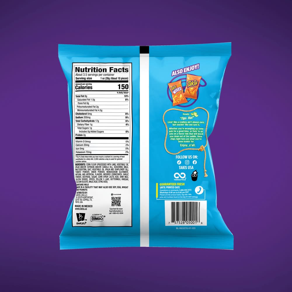 Tired of bland and boring snacks, tasteless tortilla chips, flavorless pretzels, or the same old potato chips? Change the way you munch with Takis Rolled Corn Tortilla Chips and give your taste buds the treat of deliciously intense flavor. We know the urge for a flavor-packed snack can strike at any time, leaving you in a less-than-stellar mood and putting a damper on your otherwise fantastic day. This is why we paved the way with these uniquely shaped chips that unleash tantalizing waves of flavor and fire up your tastebuds with every bite. Pack a bag to give yourself a tasty pick-me-up at school, be ready to munch away while spending the day hanging with your friends, or grab a handful for when you need a boost of flavor while hunting for new adventures. Not only are Takis rolled corn tortilla chips the ultimate snack, but they are also a great food for sharing with friends and family. Share a snack with your squad and transform a low-key hangout into a delicious celebration, or turn the vibes up to ten on your next road trip. Flavor: Buckin' ranch