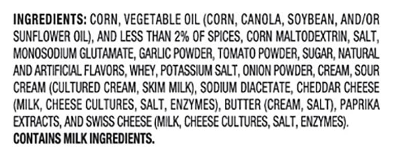 Ingredients: Corn, Vegetable Oil (Corn, Canola, Soybean, and/or Sunflower Oil), and Less than 2% of Spices, Corn Maltodextrin, Salt, Monosodium Glutamate, Garlic Powder, Tomato Powder, Sugar, Natural and Artificial Flavors, Whey, Potassium Salt, Onion Powder, Cream, Sour Cream (Cultured Cream, Skim Milk), Sodium Diacetate, Cheddar Cheese (Milk, Cheese Cultures, Salt, Enzymes), Butter (Cream, Salt), Paprika Extracts, and Swiss Cheese (Milk, Cheese Cultures, Salt, Enzymes) Contains: Milk, Soybeans