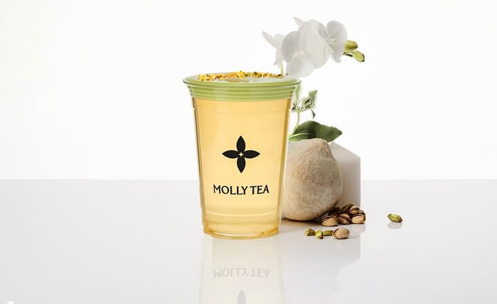 White Champaca tea mixed with coconut water has a sweet coconut scent, topped with rich pistachio cheese. It begins with a nutty aroma, shifts to a fresh orchid fragrance, and ends with a soft coconut finish.
