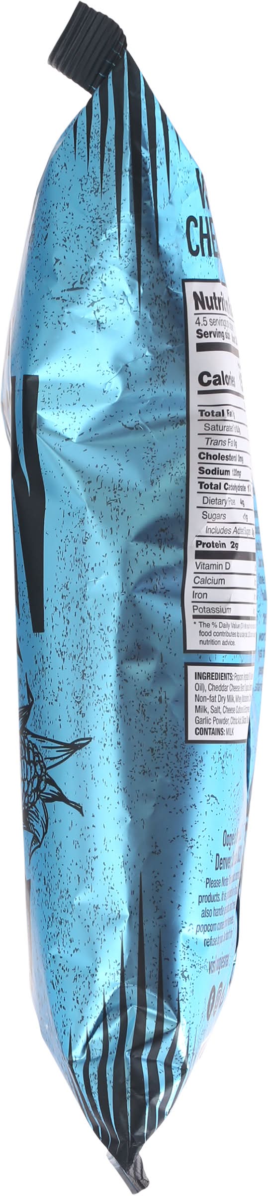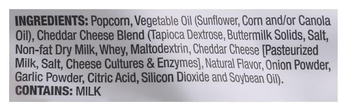 Ingredients: Popcorn, Vegetable Oil (Sunflower, Corn and/or Canola Oil), Cheddar Cheese Blend (Tapioca Dextrose, Buttermilk Solids, Salt, Non-Fat Dry Milk, Whey, Maltodextrin, Cheddar Cheese [Pasteurized Milk, Salt, Cheese Cultures & Enzymes], Natural Flavor, Onion Powder, Garlic Powder, Citric Acid, Silicon Dioxide and Soybean Oil) Contains: Milk, Soybeans, Peanuts, Tree Nuts