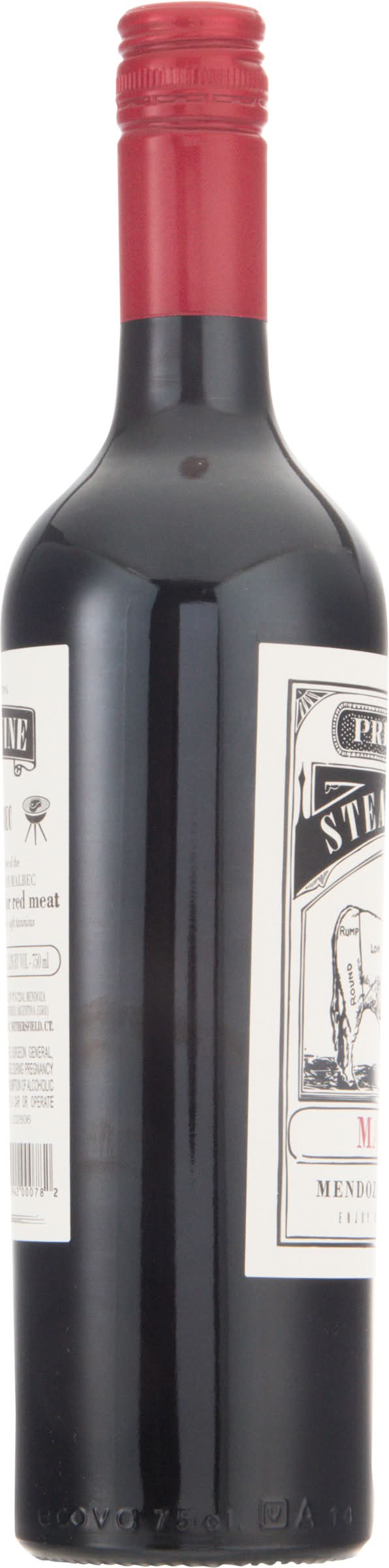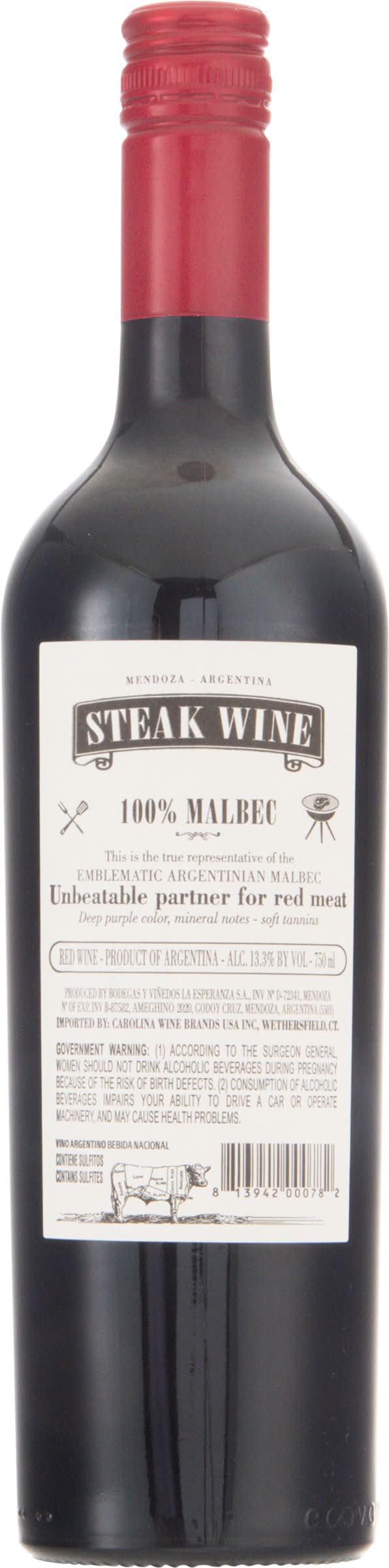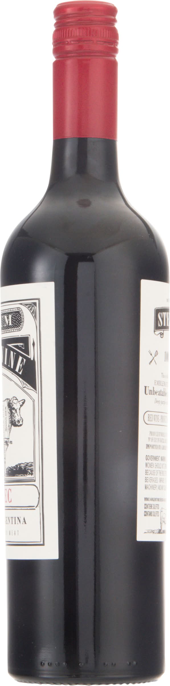 Malbec, Premium • Brand: The original steak wine • Category: Malbec • Alcohol by volume: 13.5% • Full bodied • Sweet-dry scale: dry • Tasting notes: acidic • Food pairing: pork, mushrooms • Suggested serving temperature: 65° F • Suggested glassware: standard red glass