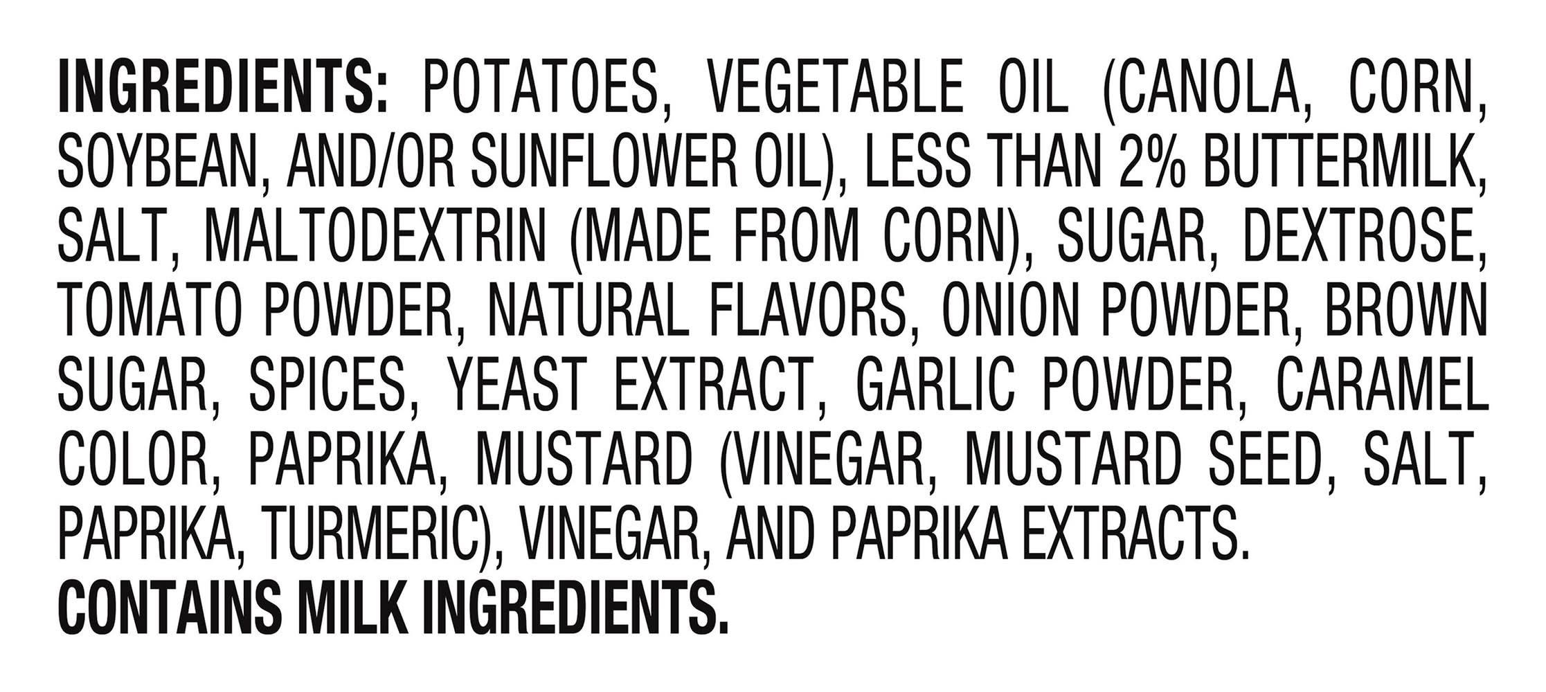 Ingredients: Potatoes, Vegetable Oil (Canola, Corn, Soybean, and/or Sunflower Oil), Less than 2% Buttermilk, Salt, Maltodextrin (Made from Corn), Sugar, Dextrose, Tomato Powder, Natural Flavors, Onion Powder, Brown Sugar, Spices, Yeast Extract, Garlic Powder, Caramel Color, Paprika, Mustard (Vinegar, Mustard Seed, Salt, Paprika, Turmeric), Vinegar, and Paprika Extracts Contains: Corn, Soybeans, Milk, Mustard