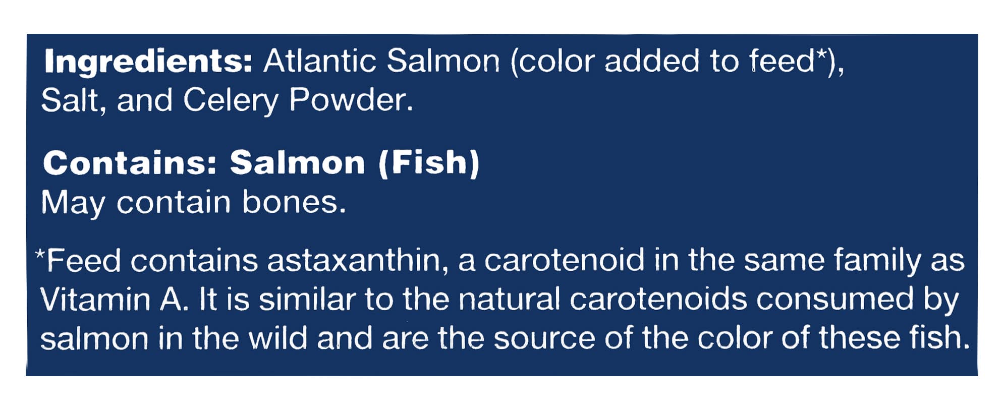 Ingredients: Atlantic Salmon (Color Added to Feed [Feed Contains Astaxanthin, a Carotenoid in the Same Family as Vitamin A, it is Similar to the Natural Carotenoids Consumed by Salmon in the Wild and Are the Source of the Color of These Fish]), Salt, and Celery Powder Contains: Fish, Salmon, Celery, Fish